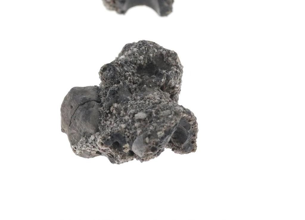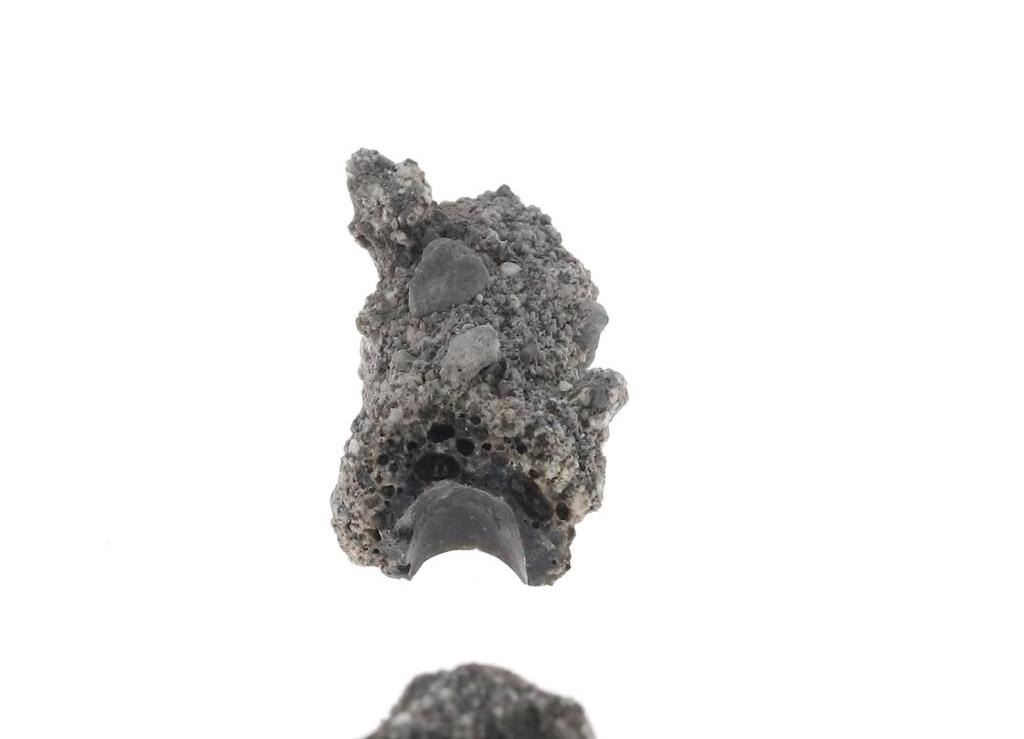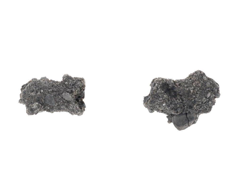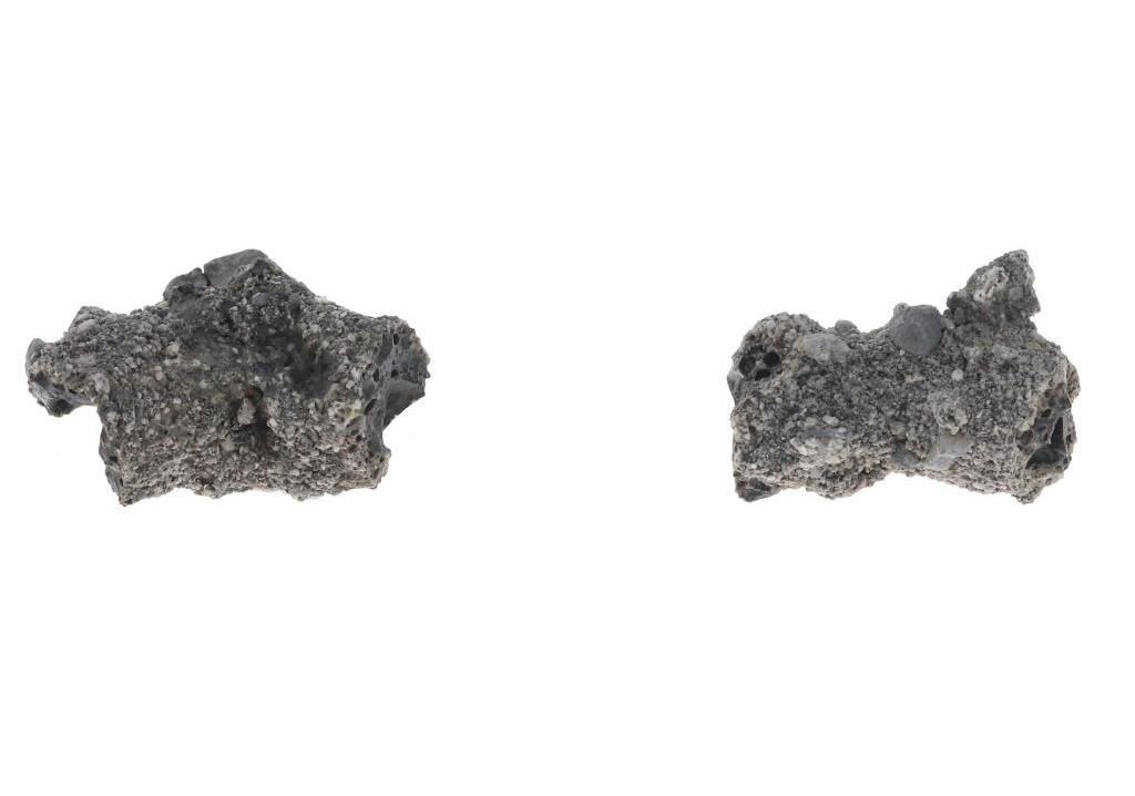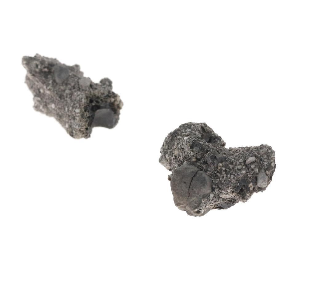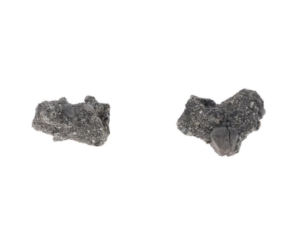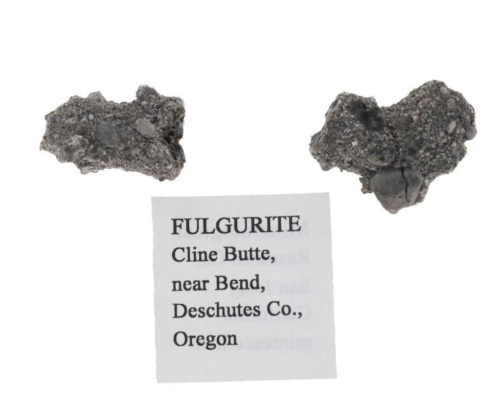 Featured in this lot are two pieces of Fulgurite found in Cline Butte, near Bend Deschutes Co., Oregon. Natural glass tubes or crusts called fulgurites are created when lightning strikes rock or silica (quartz) sand. They have a form that resembles the lightning bolt's descent into the earth. A temperature of 1800 degrees Celsius is required to instantaneously melt sand and form a fulgurite (most lightning strikes have a temperature of 2500 degrees Celsius). Sand fulgurite tubes have a glassy interior, due to rapid cooling and solidification of the sand after the lightning strike. Both of the pieces are sand fulgurites, showing hardened sand on the outside and smoothed, melted sand on the edges where the lighting struck. The pieces show colors of grey and black. The larger piece measures 1" L x 13/16" W, while the smaller piece measures 15/16" L x 1/2" W. The case they are set in measure 4 1/4" L x 3 1/4" W x 7/8" D.