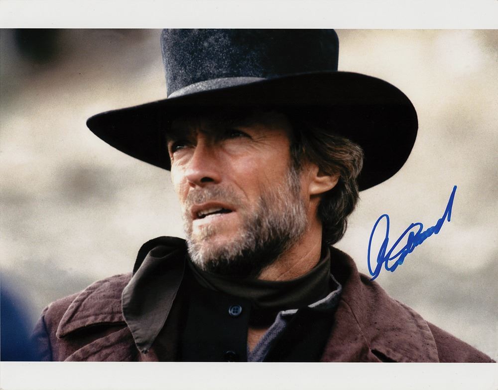 Color satin-finish 14 x 11 photo of Eastwood wearing an iconic black cowboy hat, signed in blue felt tip. In very good to fine condition, with some small bends and creases. Originally obtained by in-person specialist Mike Wehrmann.