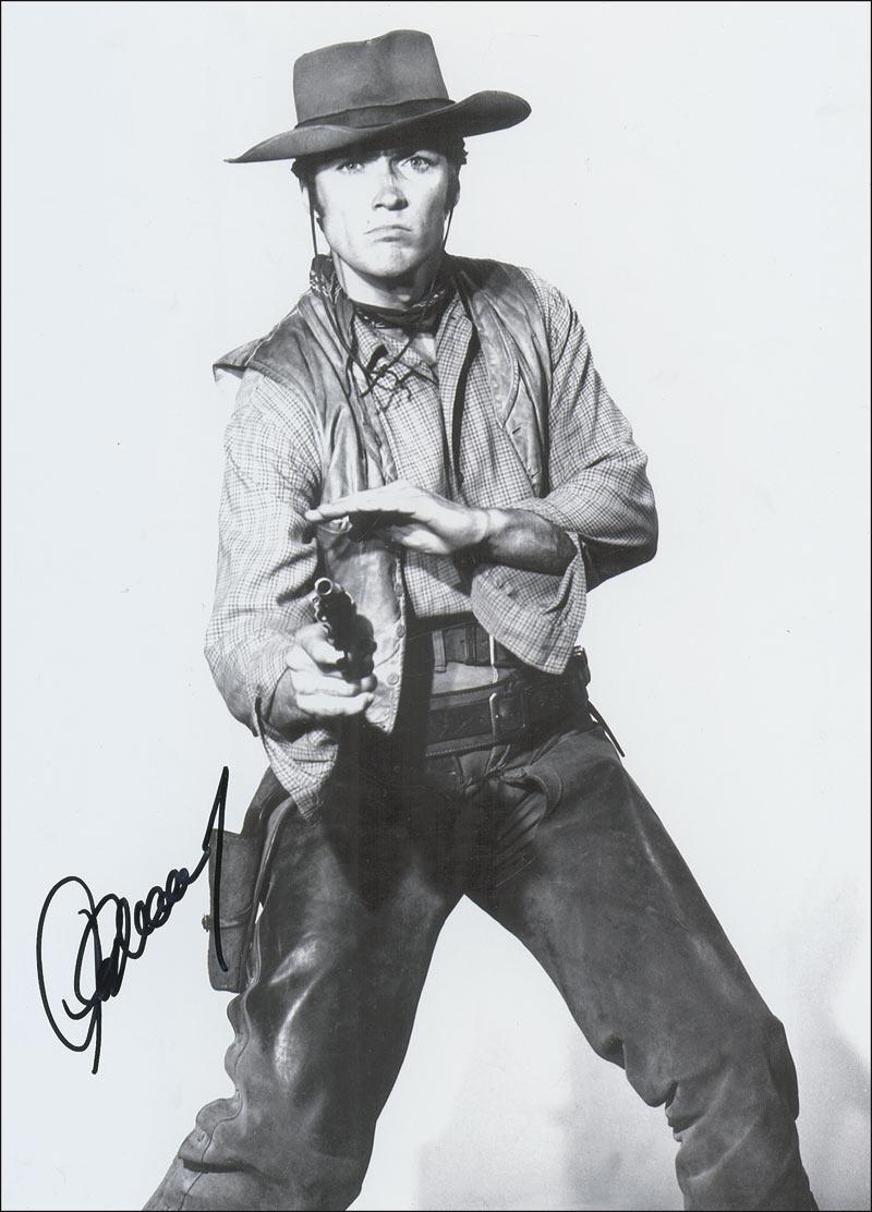Glossy 11 x 14 photo of a young Eastwood firing his six-shooter, signed in black felt tip. In very fine condition.