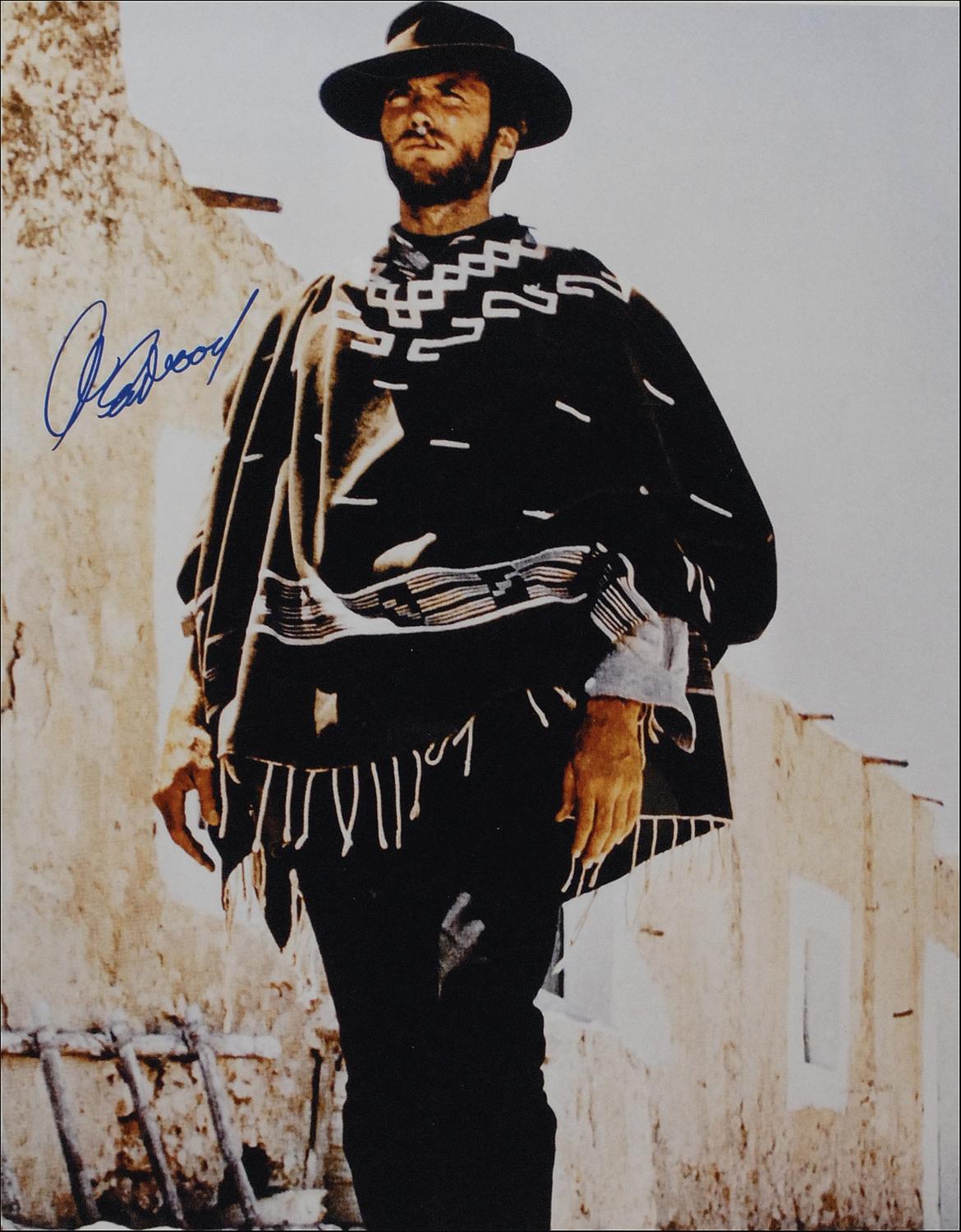Color satin-finish 15.75 x 20 photo of Eastwood from one of his early westerns, signed in blue felt tip. Rolled and in fine condition, with image a bit grainy.