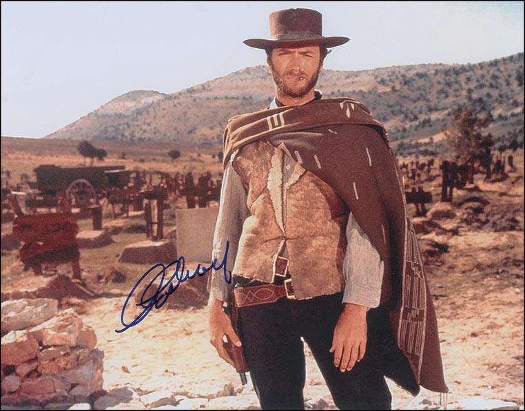 Iconic color satin-finish 14 x 11 photo of Eastwood in The Good, the Bad, and the Ugly, signed in blue felt tip. In fine condition.