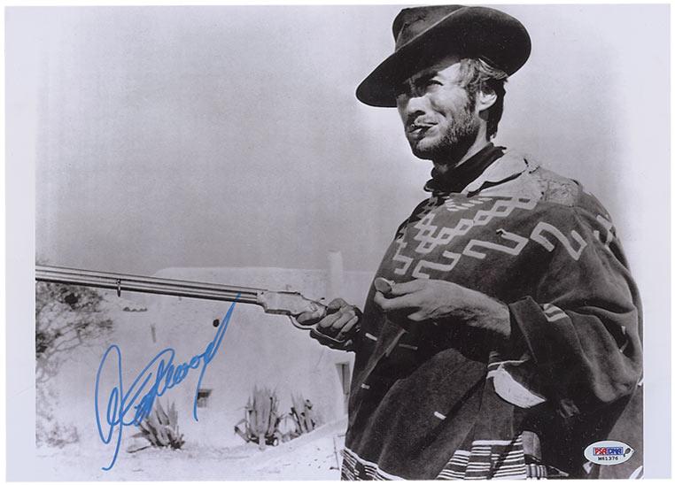 Glossy 14 x 10 photo from The Good, the Bad, and the Ugly, signed in blue felt tip. In fine condition, with a PSA/DNA authentication label affixed to bottom corner. Accompanied by a certificate of authenticity from PSA/DNA.