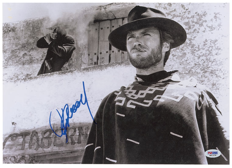 Glossy 14 x 10 photo from The Good, the Bad, and the Ugly, signed in blue felt tip. In fine condition, with a PSA/DNA authentication label affixed to bottom corner. Accompanied by a certificate of authenticity from PSA/DNA.