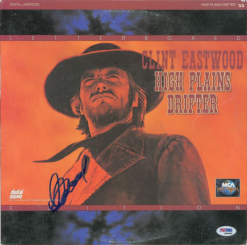 High Plains Drifter laserdisc, signed on the front cover in blue felt tip. Creases to lower right, mild ‘ring of wear,’ and a PSA/DNA authentication label affixed to lower right, otherwise fine condition. The disc is not included. Accompanied by a certificate of authenticity from PSA/DNA.