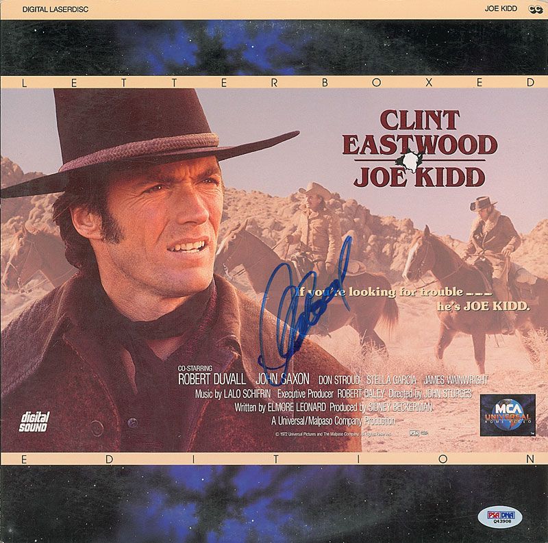 Joe Kidd laserdisc, signed on the front cover in blue felt tip. In fine condition, with a few slight edge creases, a light ‘ring of wear,’ to cover, and a PSA/DNA authentication label affixed to lower right. The disc is not included. Accompanied by a certificate of authenticity from PSA/DNA.