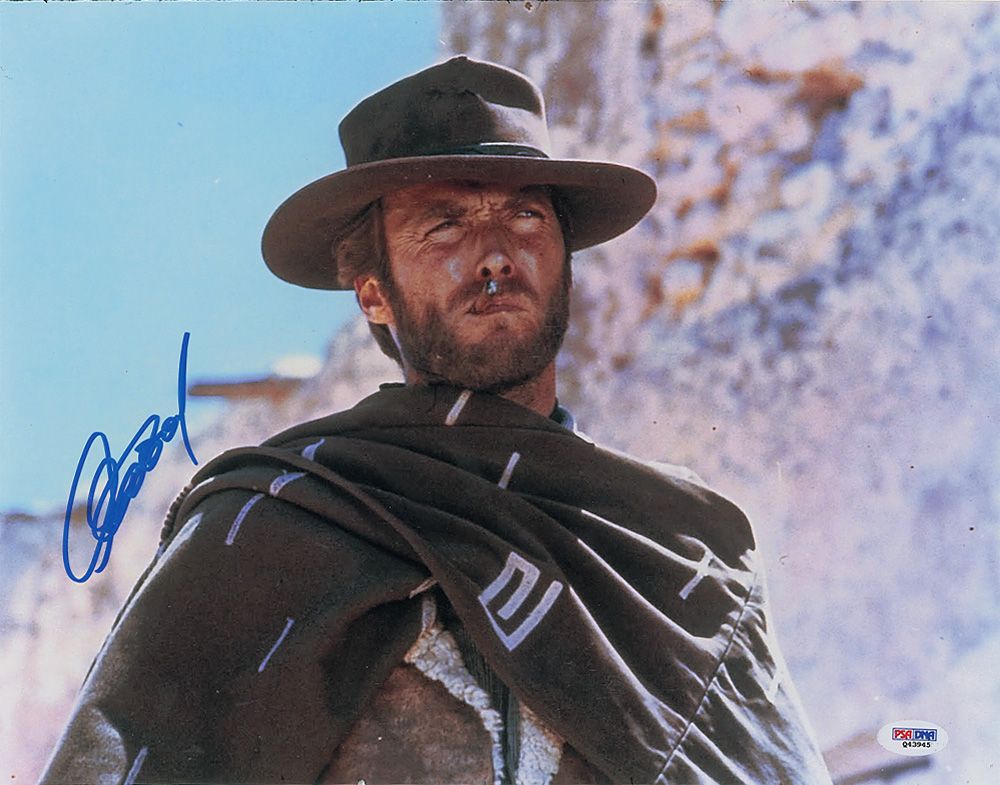 Color satin-finish 14 x 11 photo of Eastwood from one of his early westerns, signed in blue felt tip. In fine condition, with a few minor bends and a PSA/DNA authentication label affixed to lower corner. Accompanied by a certificate of authenticity from PSA/DNA.