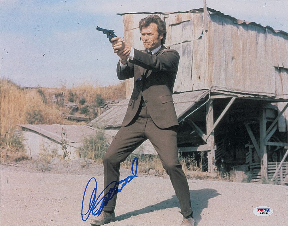 Color satin-finish 14 x 11 photo of Eastwood in Dirty Harry, signed in blue felt tip. In fine condition, with a PSA/DNA label affixed to the lower right corner. Accompanied by a certificate of authenticity from PSA/DNA.
