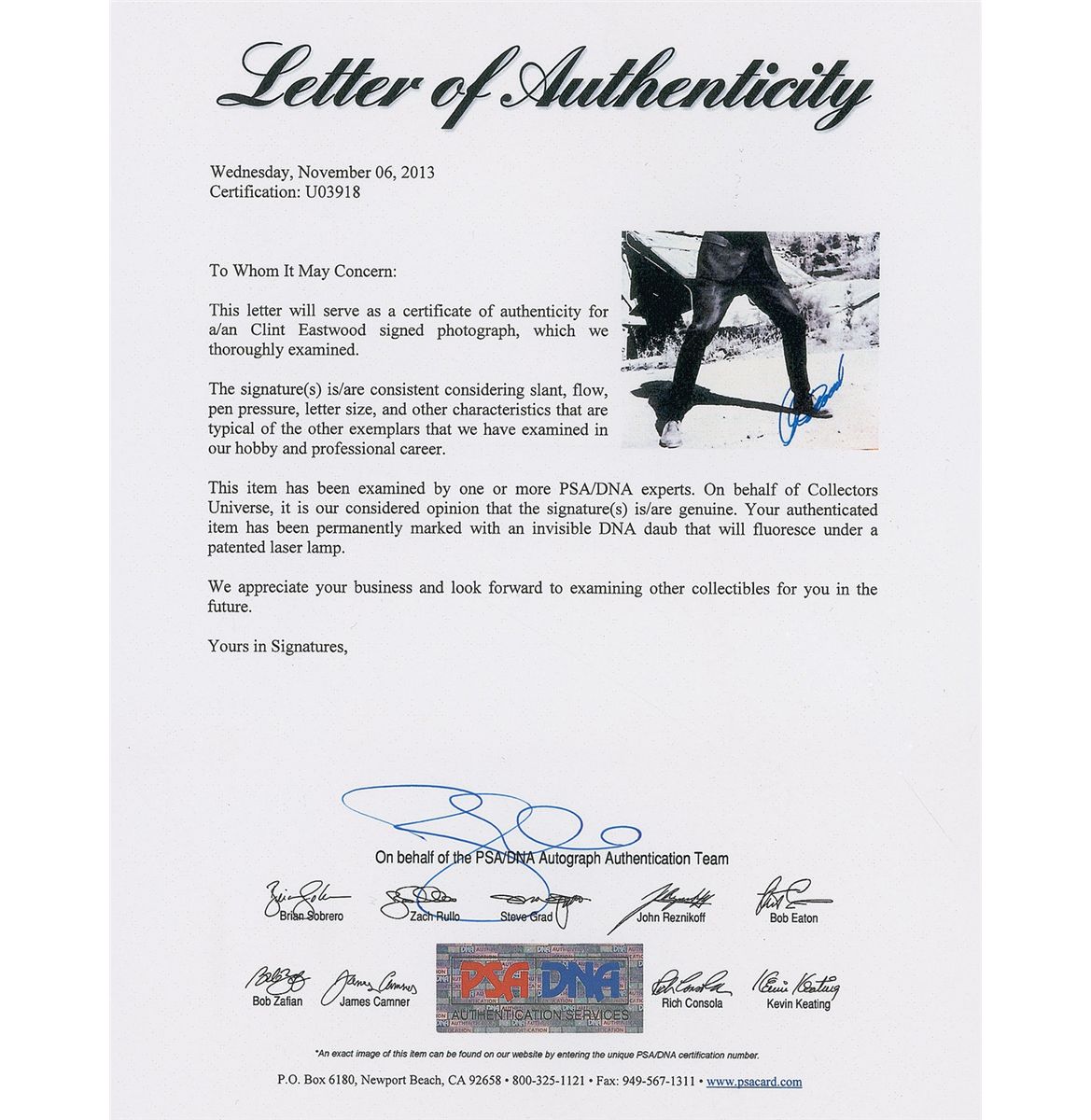 Satin-finish 11 x 14 photo of Eastwood as ‘Dirty’ Harry Callahan, signed in blue felt tip. In fine condition, with a PSA/DNA authentication label affixed to lower left corner. Accompanied by a full letter of authenticity from PSA/DNA.
