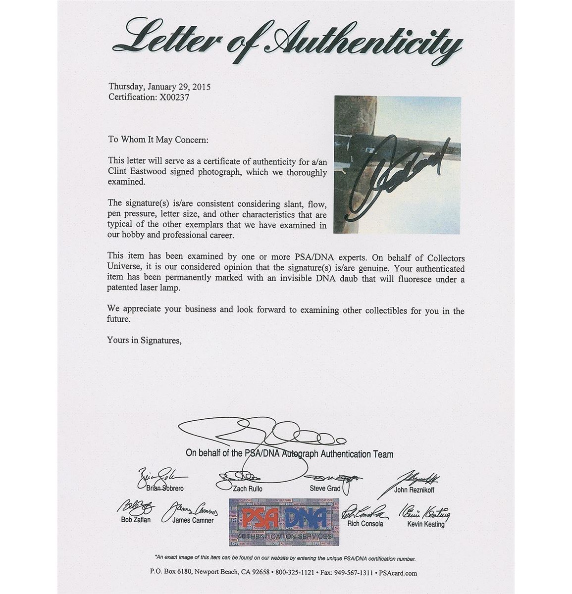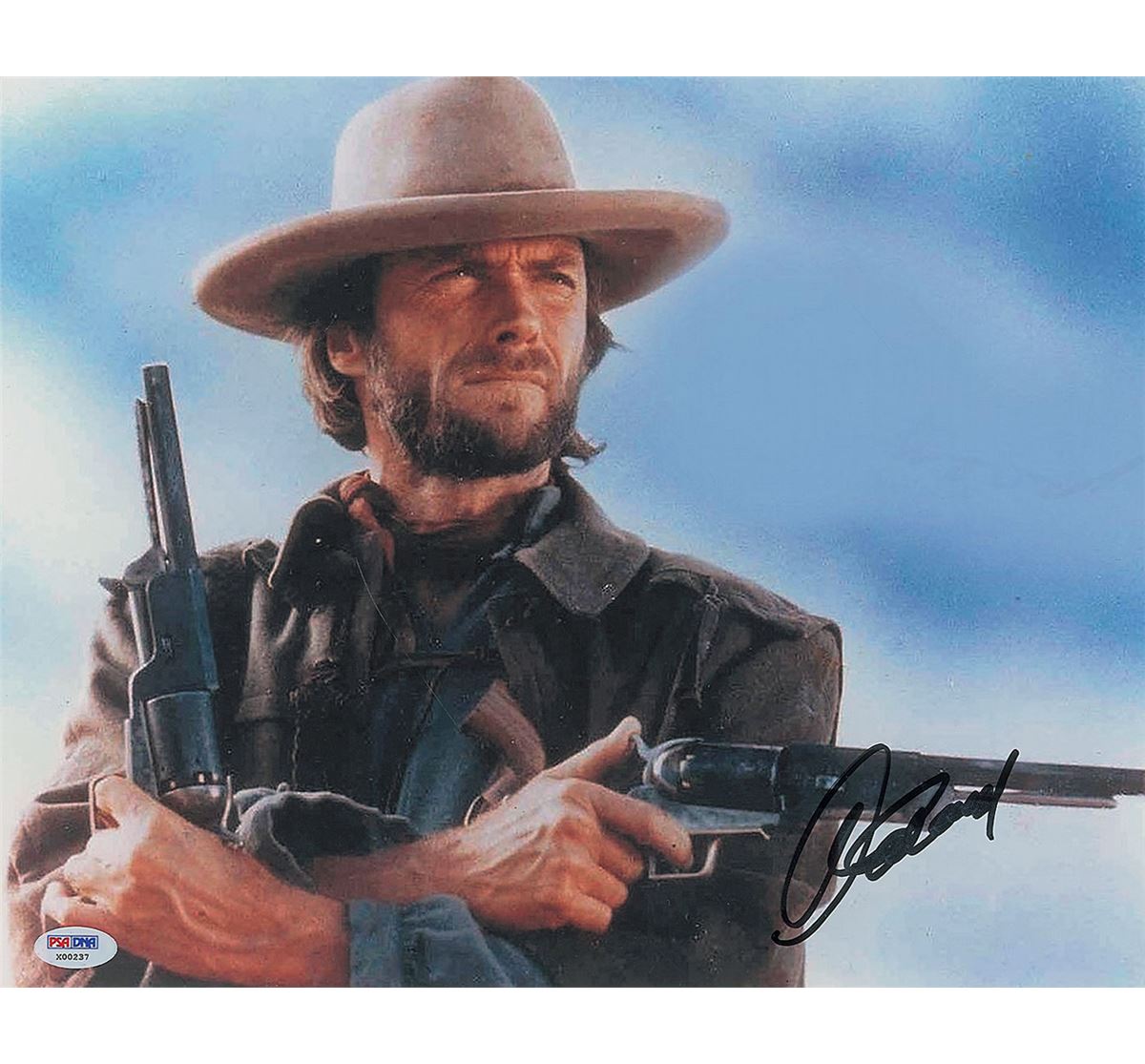 Color satin-finish 14 x 11 photo of Eastwood from the 1976 film The Outlaw Josey Wales, signed in black felt tip. In fine condition, with a slightly grainy quality to the image and a PSA/DNA label affixed to the lower corner. Accompanied by a full letter of authenticity from PSA/DNA.