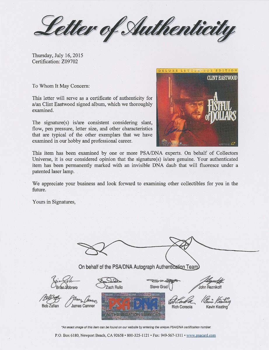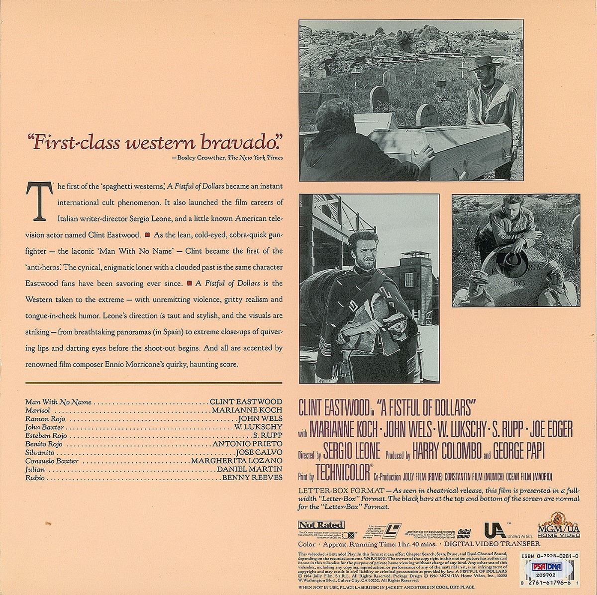 A Fistful of Dollars laser disc, signed on the front cover in blue felt tip by Eastwood. In fine condition. Accompanied by a full letter of authenticity from PSA/DNA.