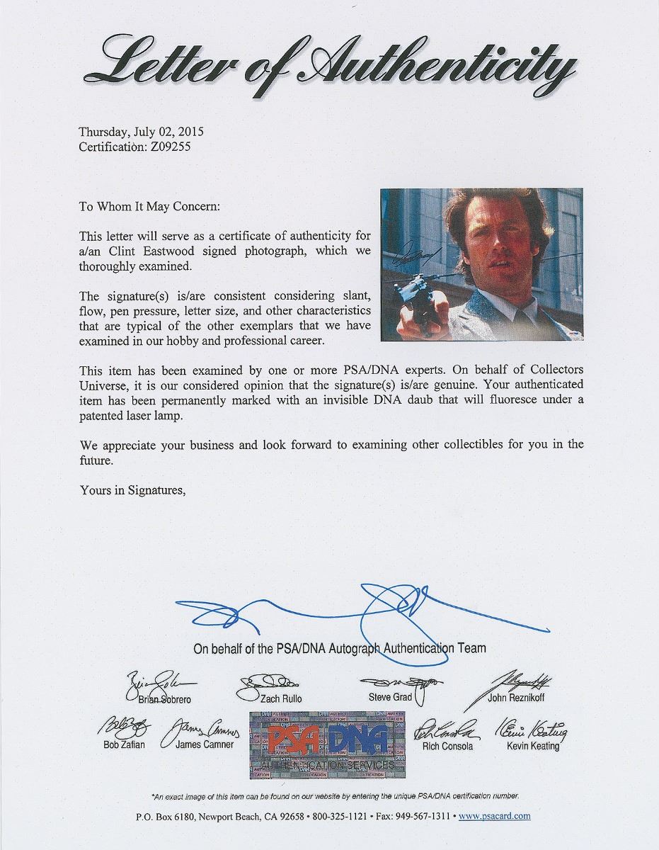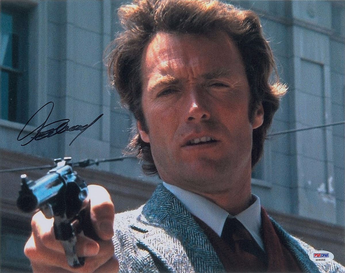 Color satin-finish 14 x 11 photo of Eastwood as the titular character from the Dirty Harry film series, signed in black felt tip. In fine condition. Accompanied by a full letter of authenticity from PSA/DNA.