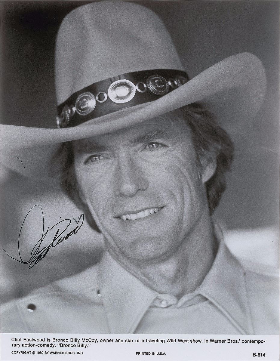 Glossy 7.5 x 9.5 Warner Bros. publicity photo of Eastwood as the titular character from the 1980 film Bronco Billy, signed in black ink. In fine condition.