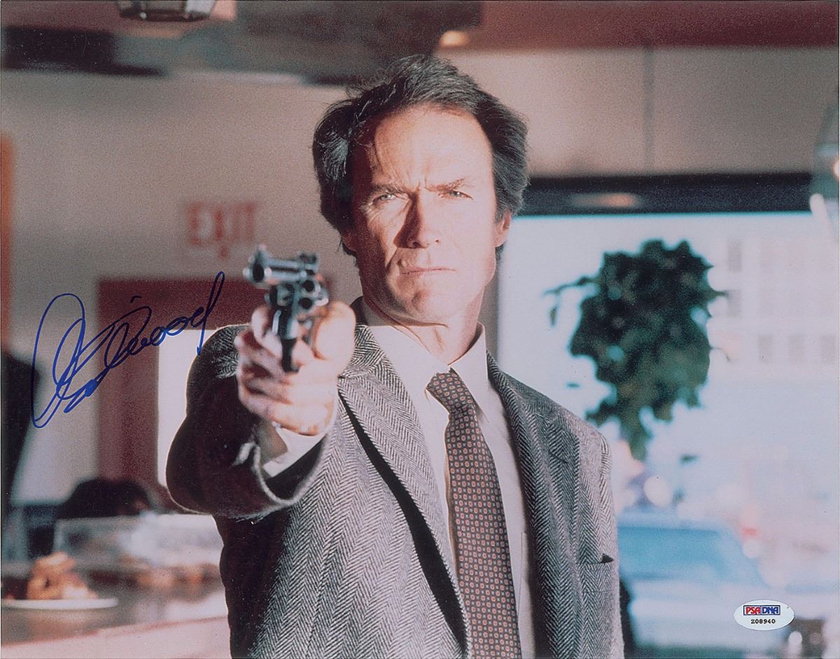 Color glossy 14 x 11 photo of Eastwood as the titular character from the Dirty Harry film series, signed in blue felt tip. In fine condition. Accompanied by a full letter of authenticity from PSA/DNA.
