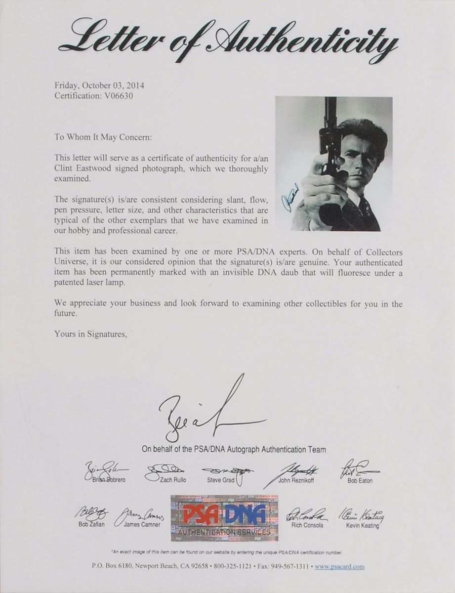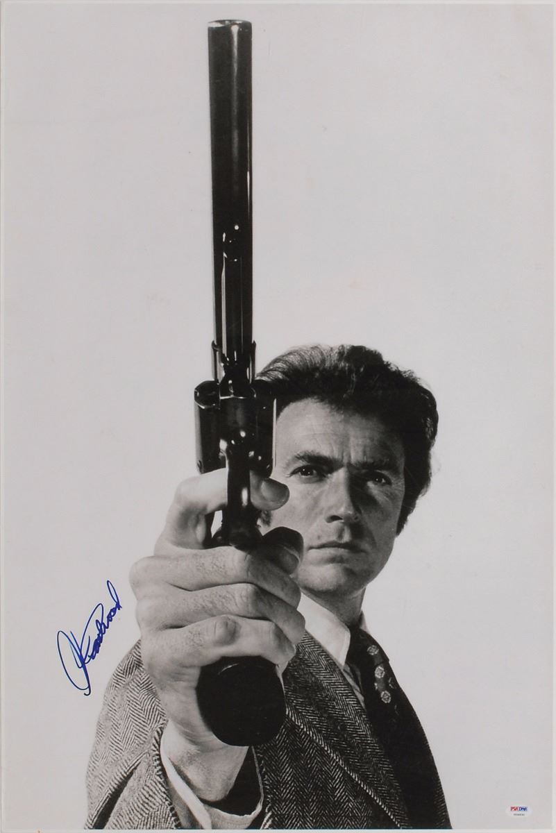 Classic semi-glossy 20 x 30 photo of Eastwood as Dirty Harry posing with his Smith & Wesson .44 Magnum, signed in blue felt tip. Rolled and in fine condition, with scattered light creases. Accompanied by a full letter of authenticity from PSA/DNA.