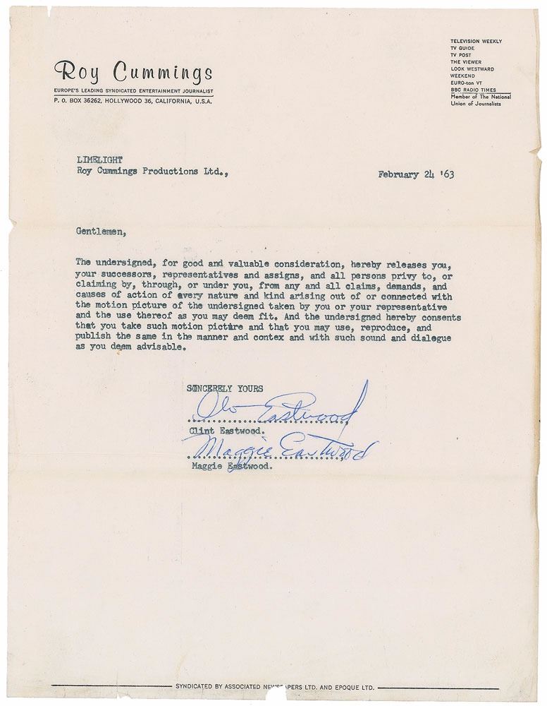 DS, one page, 8.5 x 11.25, February 24, 1963. Release form for Roy Cummings Productions, in part: "The undersigned hereby consents that you take such motion picture and that you may use, reproduce, and publish the same in the manner and context and with such sound and dialogue as you deem advisable." Signed at the conclusion in blue ballpoint by Clint Eastwood and Maggie Eastwood. In fine condition, with small areas of paper loss to the edges. Accompanied by an original glossy 8 x 10 photo featuring two images of Eastwood.
