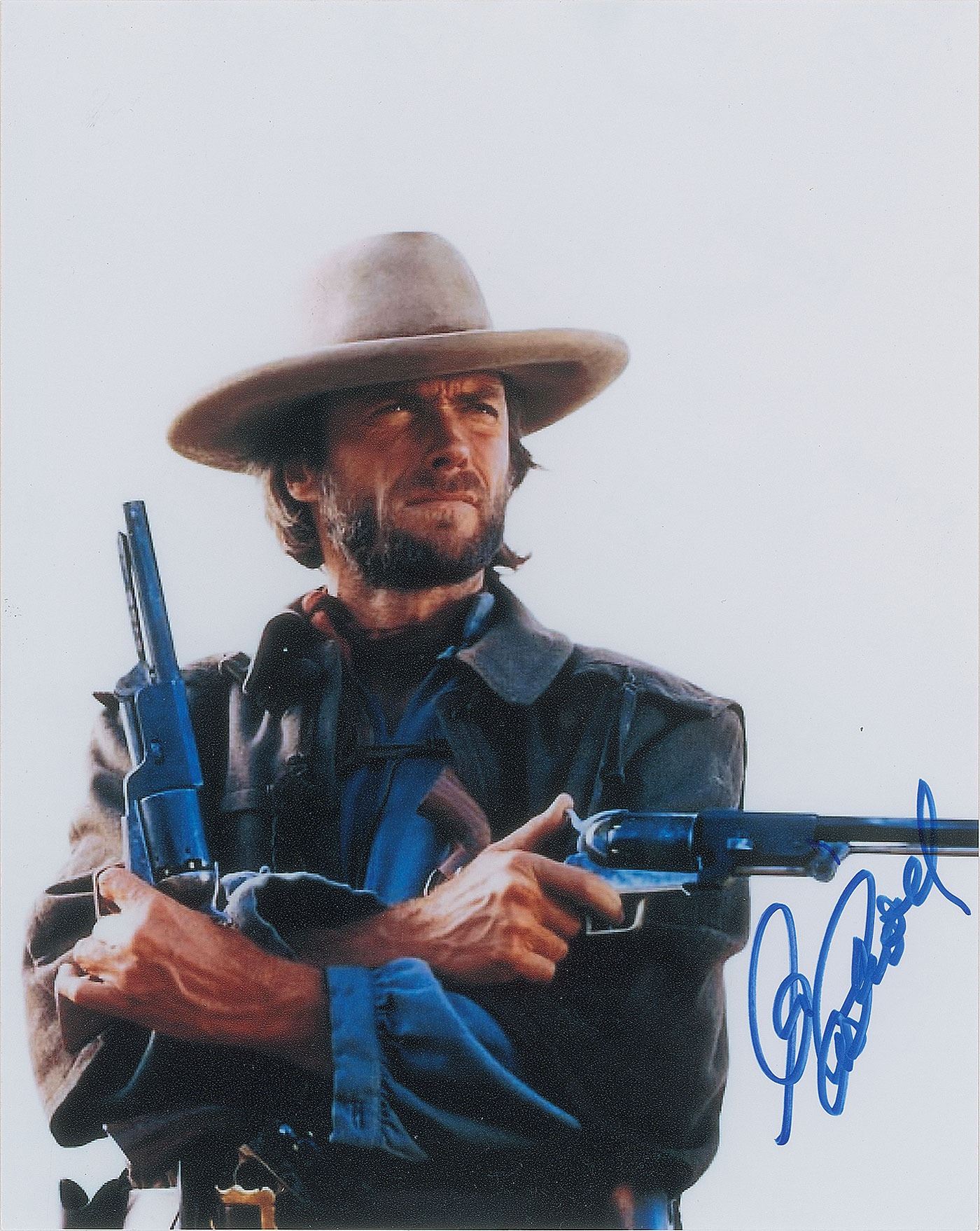 Color satin-finish 8 x 10 photo of Eastwood with crossed pistols in the 1976 film The Outlaw Josey Wales, signed in blue felt tip. In very fine condition.