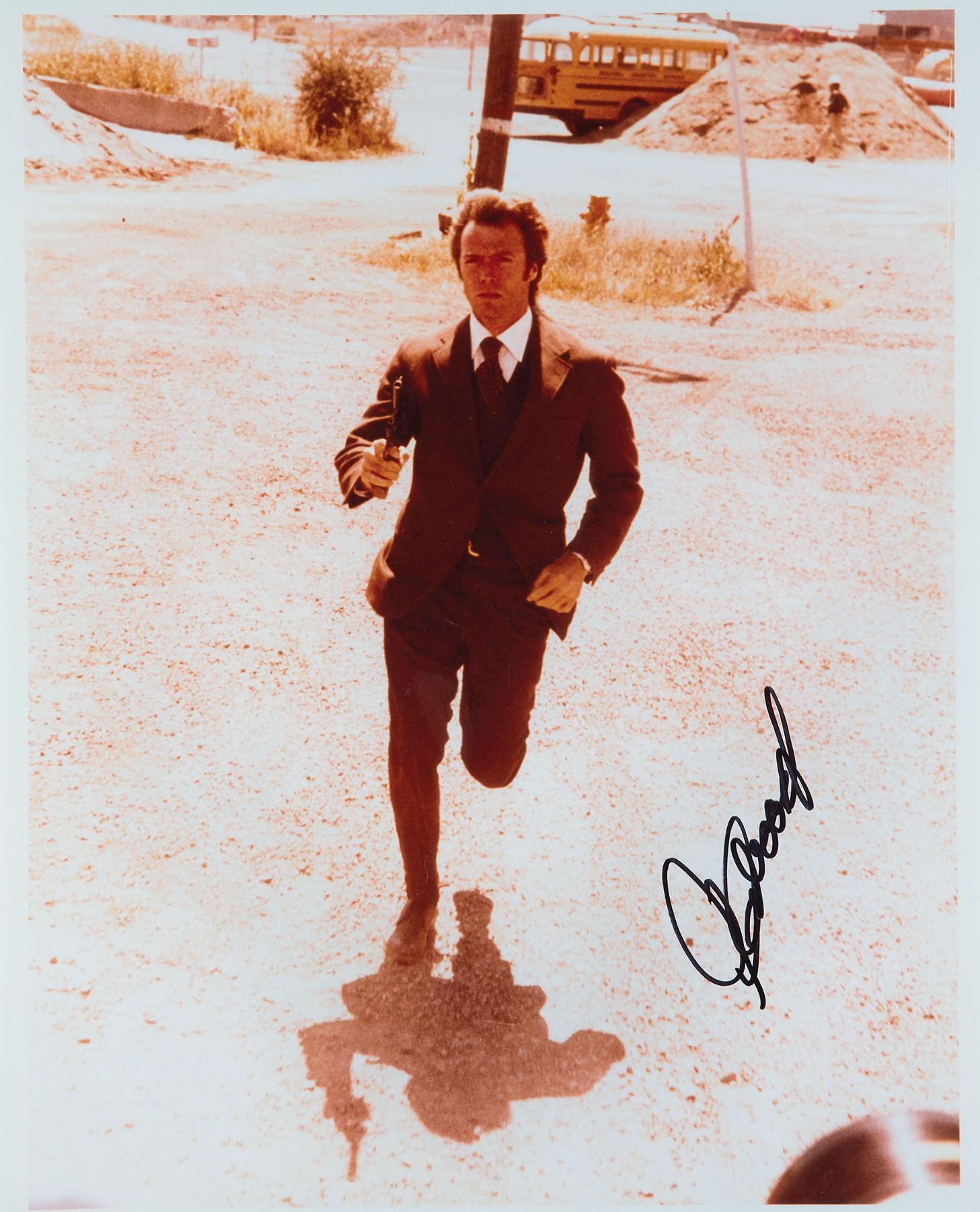 Color satin-finish 11.25 x 14 full-length photo of Clint Eastwood running with a gun in the 1971 film Dirty Harry, signed in black felt tip. In fine condition.