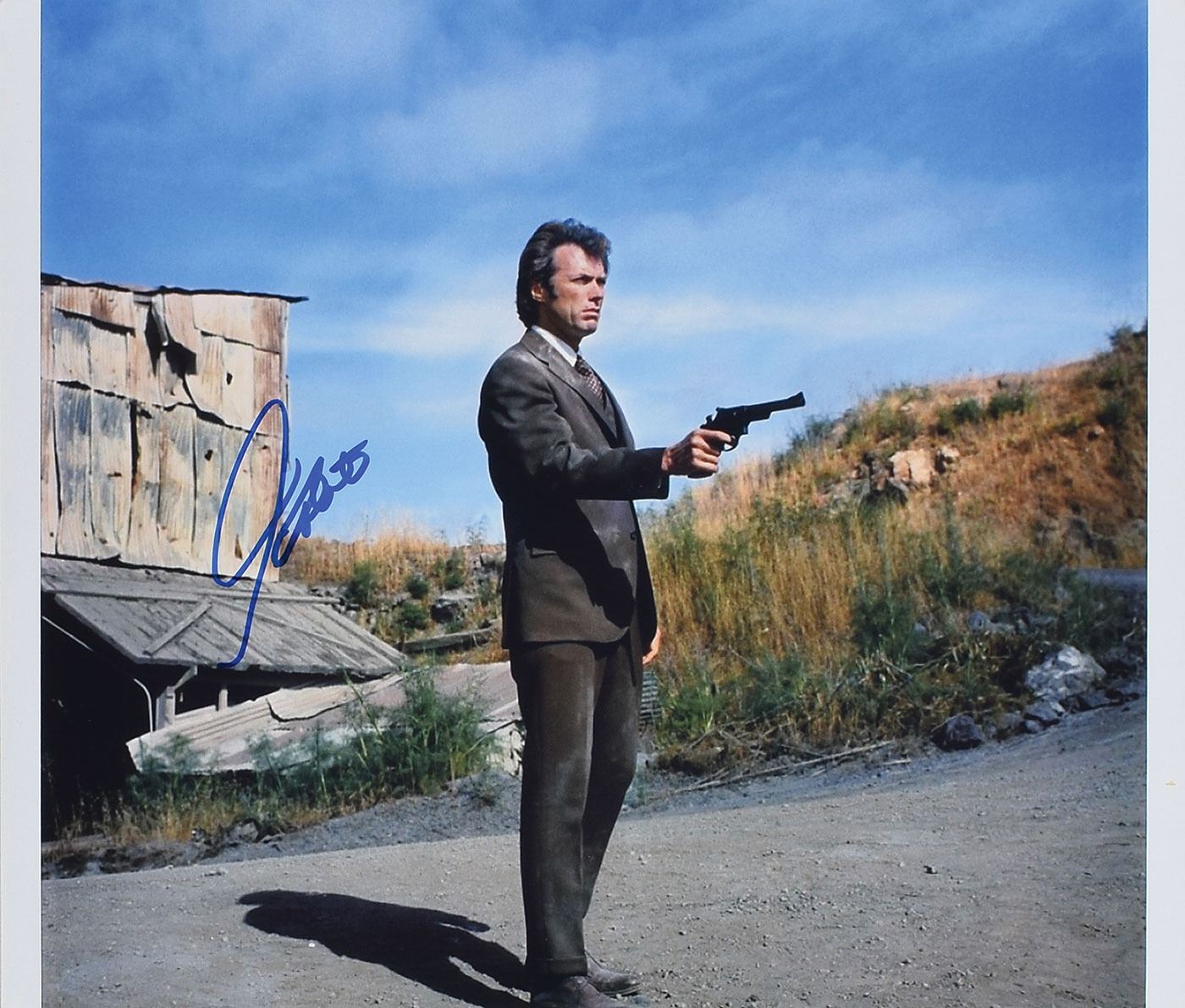 Color satin-finish 14 x 12 full-length photo of Clint Eastwood as the titular character from the Dirty Harry film series, signed in blue felt tip. In very good to fine condition, with overall light creasing.
