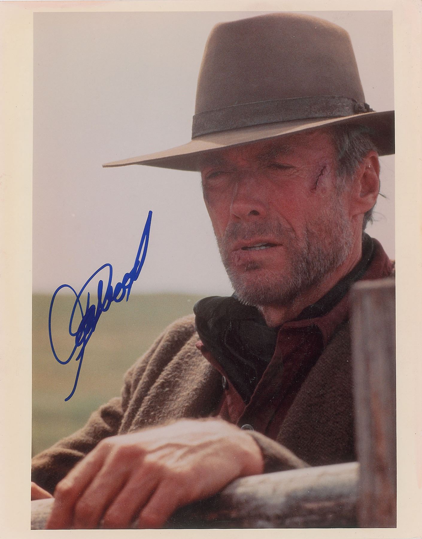 Color glossy 8 x 10 photo of Clint Eastwood as William Munny for the Oscar-winning 1992 western Unforgiven, signed in blue felt tip. In fine condition, with minor emulsion irregularity.