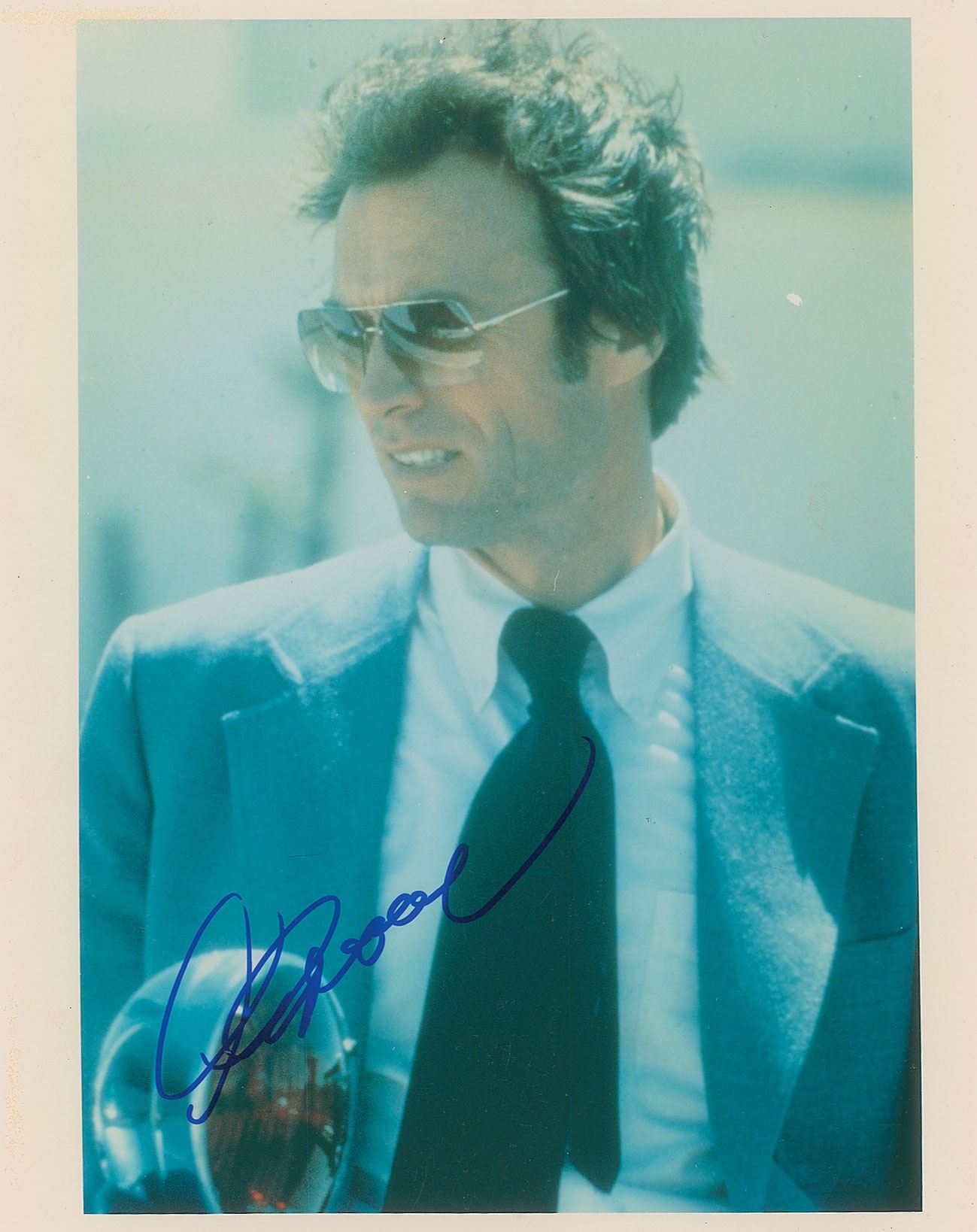 Color glossy 8 x 10 half-length photo of Clint Eastwood wearing sunglasses during one of his films, signed in blue felt tip. In fine condition.