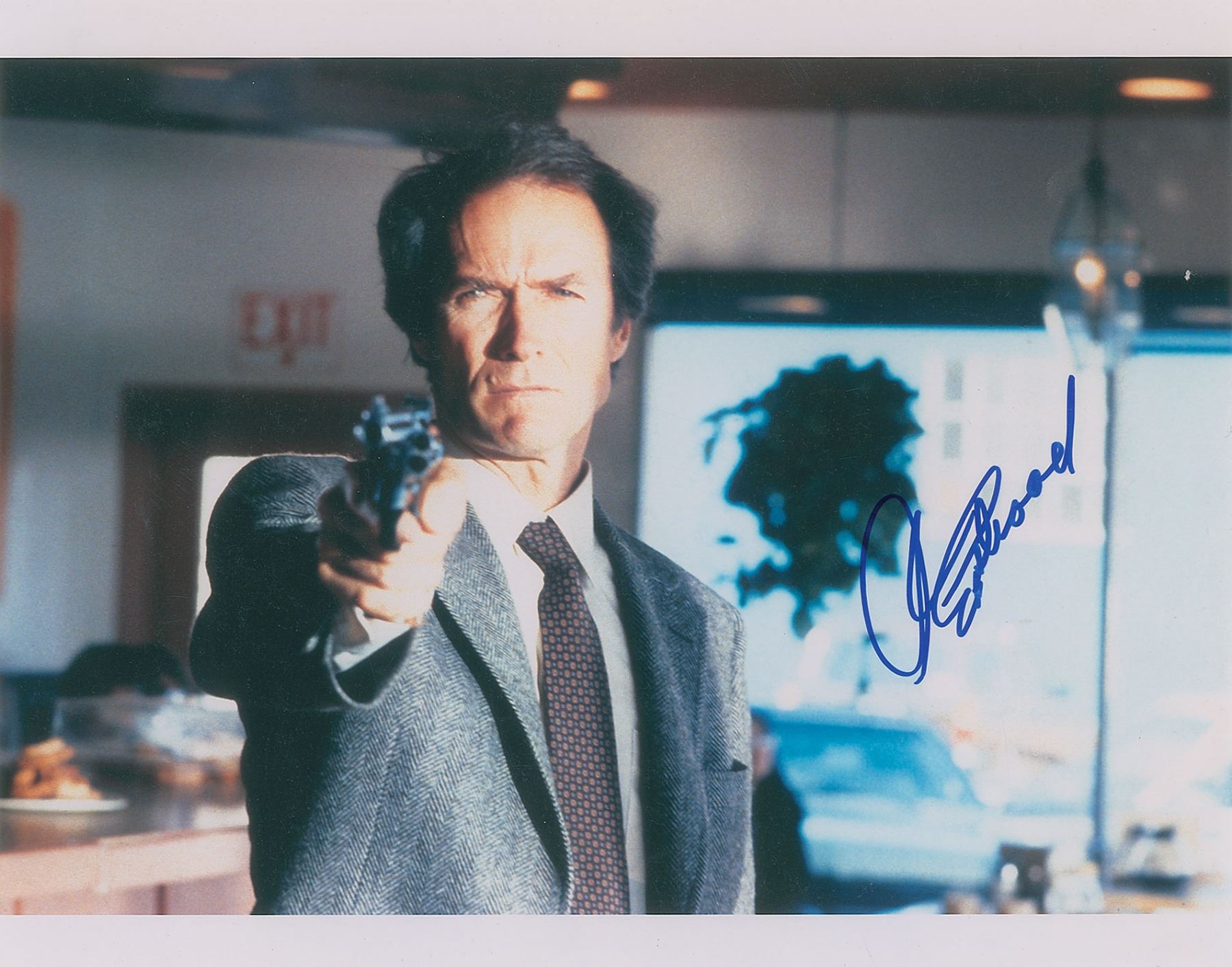 Color satin-finish 14 x 11 half-length photo of Clint Eastwood as the titular character from the Dirty Harry film series, signed in blue felt tip. In fine condition, with scattered small surface creases. Originally obtained by in-person specialist Mike Wehrmann.