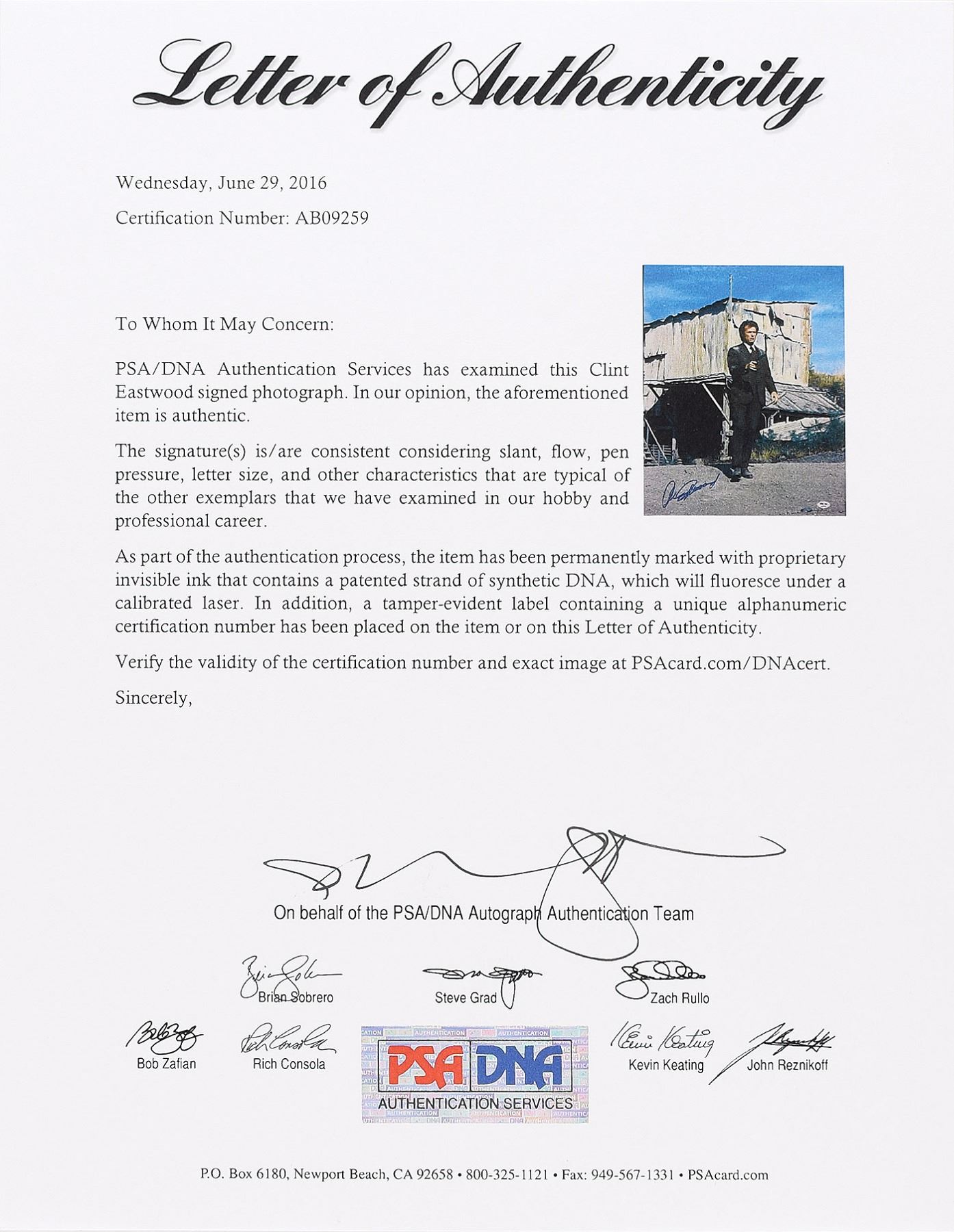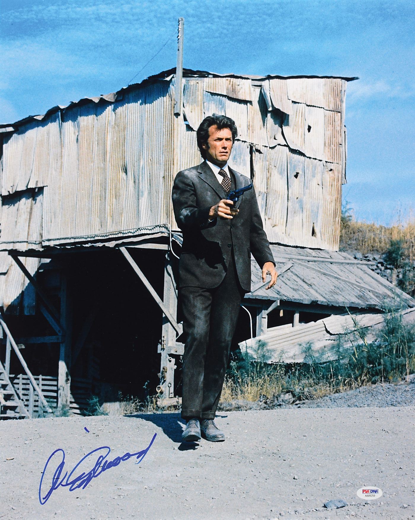 Color satin-finish 16 x 20 photo of Clint Eastwood as the titular character from the Dirty Harry film series, signed in blue felt tip. In very good to fine condition, with creasing to the two bottom corners and a PSA/DNA label affixed to lower right corner. Accompanied by a full letter of authenticity from PSA/DNA.