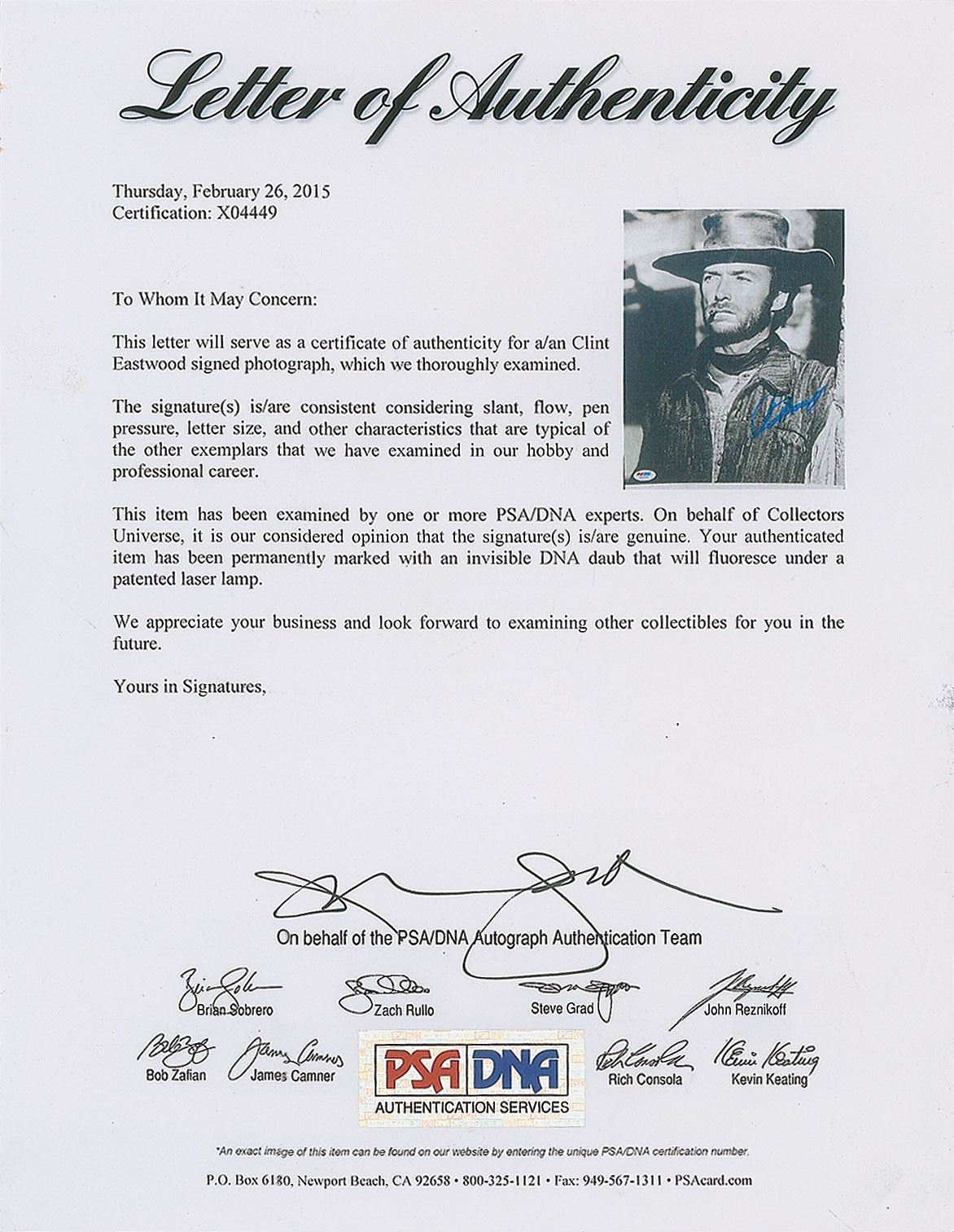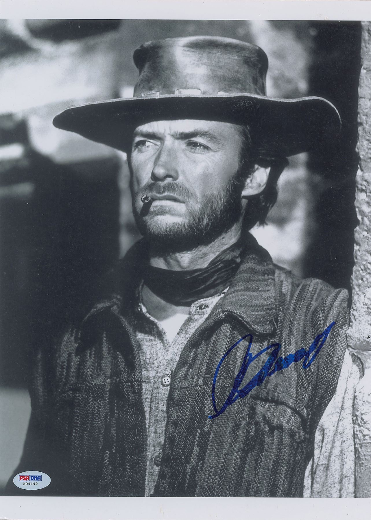 Glossy 10 x 14 close-up photo of Clint Eastwood as Blondie from the 1966 film The Good, the Bad and the Ugly, signed in blue felt tip. In fine condition, with a PSA/DNA label affixed to lower left corner. Accompanied by a full letter of authenticity from PSA/DNA.