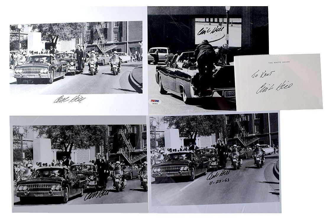 Four photos and a White House stationery card (ins), ranging in size from 6.5 x 4 to 11 x 8.5, each signed in black ink or felt tip by former United States Secret Service agent Clint Hill. The photos include three images of the presidential motorcade in Dealey Plaza and one image of Hill climbing the presidential limousine to shield the president and first lady. In overall fine condition, with a PSA/DNA label affixed to the Jackie photo. Accompanied by a certificate of authenticity from PSA/DNA for the Jackie photo.