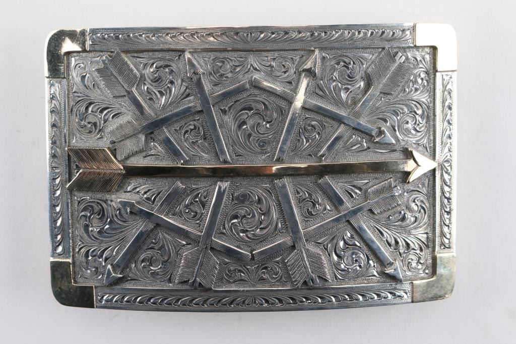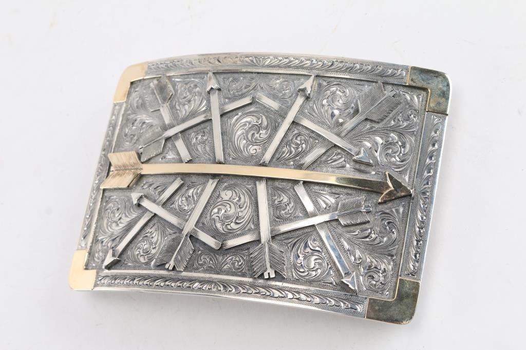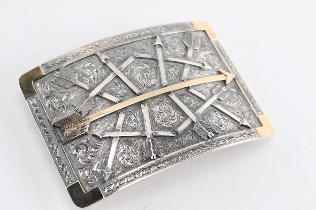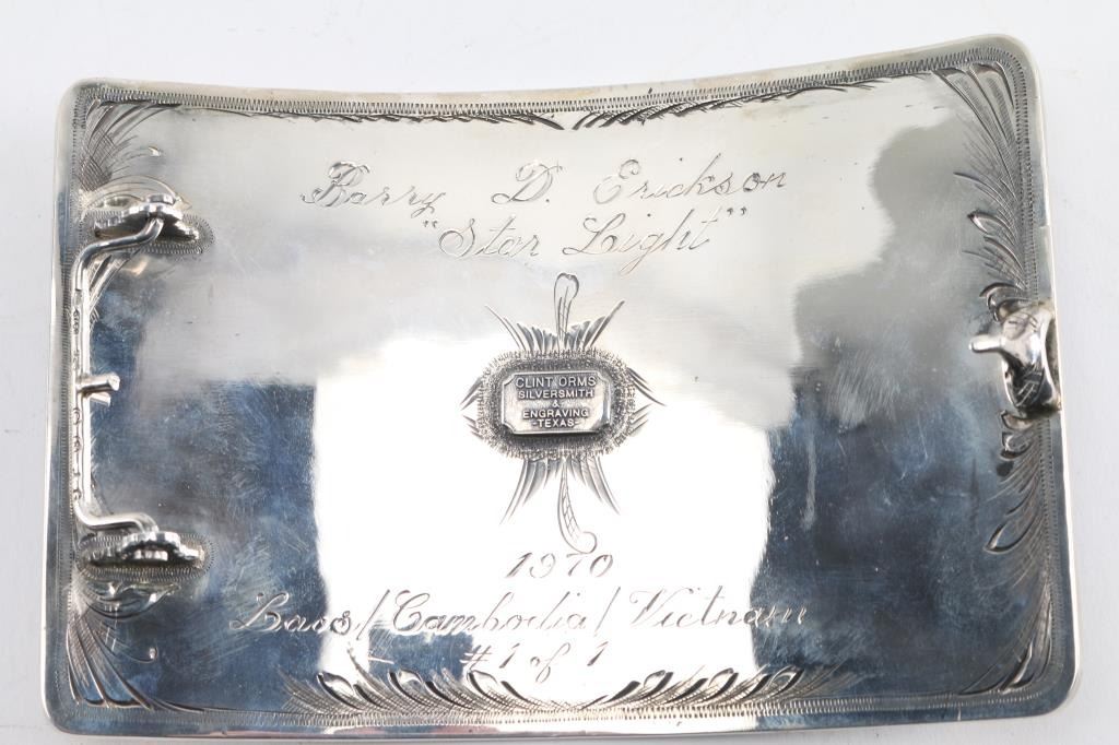 All sterling belt buckle accented with gold and silver arrows. Inscribed "Barry D. Erickson, Star Light, 1970, Laos/Cambodia/Viet Nam, One of One, 1970". 5 1/2" x 4". Maker marked Clint Orms Silversmith and Engraving, Texas. From the Barry Erickson Collection.