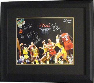 Led by Hall of Famer Julius Erving and All-Stars Maurice Cheeks, Andrew Toney, and Bobby Jones they dominated the regular season, winning 65 games in what is still the second most winning year in franchise history. Malone was named league MVP, and when reporters asked how the playoffs would run, he answered, "four, four, four" — in other words, predicting that the Sixers would sweep all three rounds to win the title, with the minimum 12 games. Malone, speaking in a non-rhotic accent, pronounced the boast "fo', fo', fo'." The Sixers went on to win their third NBA championship (and second in Philadelphia) with a four-game sweep of the Los Angeles Lakers This 16x20 photograph has been personally hand signed by the 6 of the 1983 Philadelphia 76ers basketball team including: Earl Cureton, Clint Richardson, Bobby Jones, Reggie Johnson, Clemon Johnson & Franklin Edwards. Leaf Authentics Hologram and Certificate of Authenticity from Athlon Sports. Custom Black Mat and Premium Black Frame as shown.