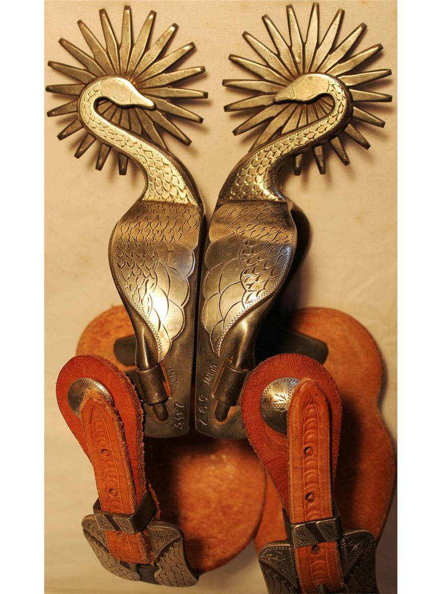 Contemporary Silver Mounted Spurs marked Clint; a spectacular double mounted pair of swans with 2" rowels and flower tooled straps with silver buckle sets. In unused condition.