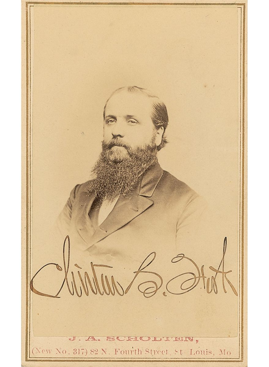 Union officer (1828–1890) for whom Fisk University in Nashville is named. Original 2.25 x 4 carte-de-visite photo by an anonymous studio, signed below the image in black ink, In fine condition, with a couple trivial creases.