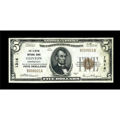 <B>Clinton, CT</B></I> - $5 1929 Ty. 1 <B>The Clinton NB</B></I> Ch. # 1314<BR> A nice serial number 1 example with enough grade to count. <B>Choice Crisp Uncirculated, </B></I>with just a bit of handling evident. <BR><BR><b>Shipping:</b> Coins & Currency (<a target="_blank" href="http://www.heritageauctions.com/common/shipping.php">view shipping information</a>)