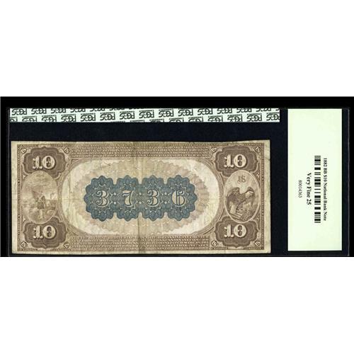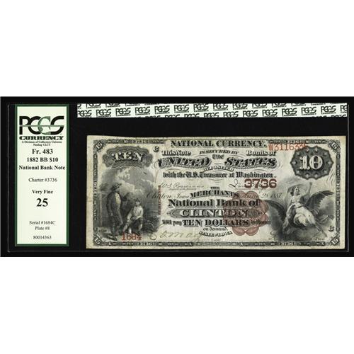 <B>Clinton, IA</B></I> - $10 1882 Brown Back Fr. 483 <B>The Merchants NB</B></I> Ch. # 3736<BR>The bank officer signatures are present and a minimum of soiling establishes this <B>PCGS Very Fine 25</B></I> $10 as a great addition to an Iowa Collection.