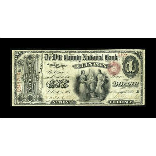 <B>Clinton, IL</B></I> - $1 Original Fr. 382 <B>The DeWitt County NB</B></I> Ch. # 1926<BR>This is the only First Charter of any denomination known from this bank. <B>Fine,</B></I> with a couple of repaired splits.