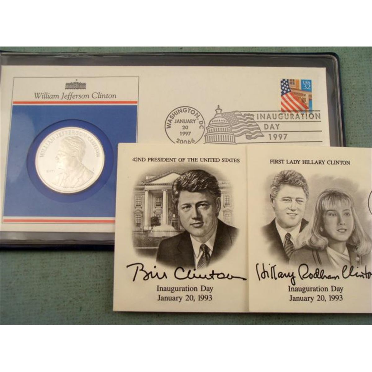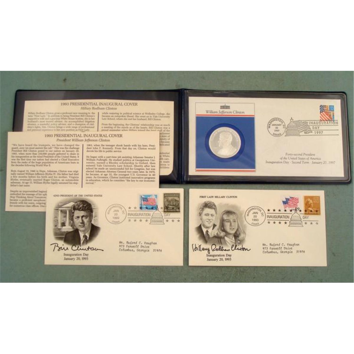 Clinton Inaugural Proof Coin with Stamps, in blue folder with White House emblem * Coin * * Designer: Frank GasparroRarity: Considered Very RareCondition: ProofDiamaeter: 1.50" * Stamps * 2 1993 USPS covers2 Historical inserts included
