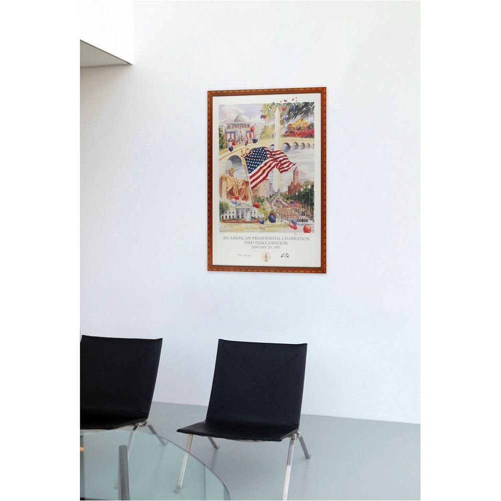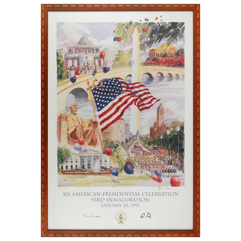 Handsome limited edition color 23.25 x 35.25 print honoring the second inauguration of President Bill Clinton, which is entitled “An American Celebration, 53rd Inauguration, January 20, 1997.†The print, numbered 357/1000, features a watercolor painting by Marlene Colucci, which shows a festive Washington, D.C. collage on inauguration day, and is signed in the lower right in pencil by the artist. The Bill Clinton and Al Gore signatures to lower border are facsimiles inherent to the print. Attractively framed to an overall size of 25.5 x 49.5. In fine condition.