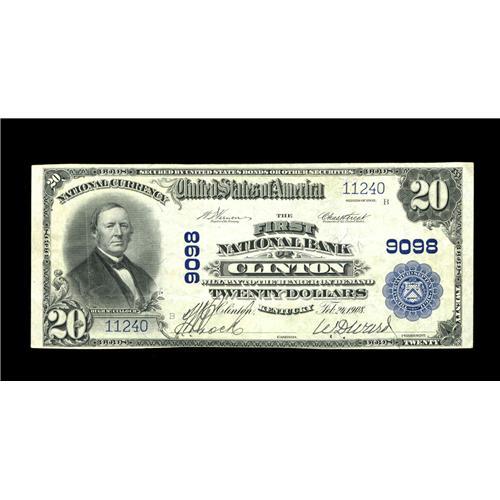 <B>Clinton, KY</B></I> - $20 1902 Plain Back Fr. 652 <B>The First NB</B></I> Ch. # 9098<BR>A most attractive note which is the highest grade Blue Seal reported from this by no means common issuer. Pen signed <B>Very Fine+++.</B></I>