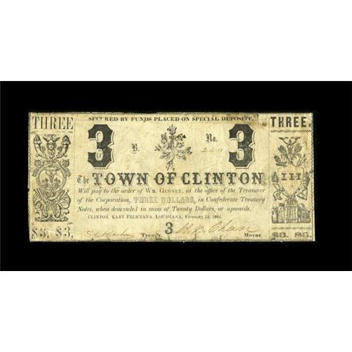 <B>Clinton, LA- Town of Clinton</B></I> $3 Feb. 22, 1862<BR> An extremely scarce municipal issue in this denomination. <B>Very Good,</B></I> with some tape repairs on the reverse.<BR><I>From The Collection of a Louisiana Gentleman.</B></I><BR><BR><b>Shipping:</b> Coins & Currency (<a target="_blank" href="http://www.heritageauctions.com/common/shipping.php">view shipping information</a>)