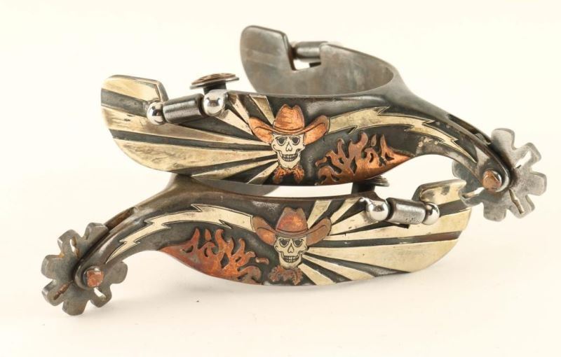 Fire and a lightning bolt fans out behind a skull wearing a cowboy hat and kerchief. Silver and copper overlay, marked "C.M.". Leather button has a spiderweb design. Very unique.