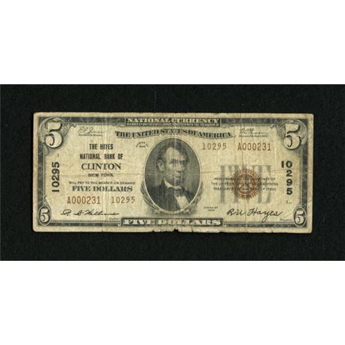 <B>Clinton, NY</B></I> - $5 1929 Ty. 2 <B>The Hayes NB</B></I> Ch. # 10295<BR> Auction appearances are slim with only four small size notes in the census. This <B>Very Good</B></I> displays a bit of fraying along the bottom.<BR><BR><b>Shipping:</b> Coins & Currency (<a target="_blank" href="http://www.heritageauctions.com/common/shipping.php">view shipping information</a>)