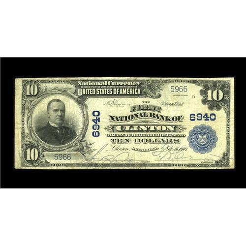 <B>Clinton, OK</B></I> - $10 1902 Plain Back Fr. 626 <B>The First NB</B></I> Ch. # 6940<BR>This is a very scarce bank in large size, with the census standing at just three pieces, including this specimen. It's virtually identical in grade to the example we sold from here in our last sale which realized $2070. <B>Fine-Very Fine.</B></I><BR><BR><b>Shipping:</b> Coin/Currency (<a target="_blank" href="http://www.heritageauctions.com/common/shipping.php">view shipping information</a>)