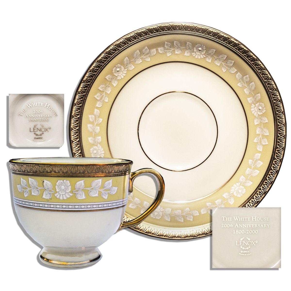 White House used china cup and saucer from the Clinton administration. Cup and saucer set are part of the 3600-piece collection by Lenox of Trenton, New Jersey, the service commissioned for the 200th anniversary of the White House in the year 2000. This collection broke ground as the very first to incorporate an image of the White House itself on official china; it supplants the traditional presidential seal design on the service platter. Cup and matching saucer feature embossed gilt edges and then a yellow border with a floral design in white and grey, all upon the classic Lenox ivory china. Backstamp reads, ''The White House / 200th Anniversary / 1800-2000 / Lenox / [copyright] Lenox / Made in USA'' in gilt. Footed tea/coffee cup measures 3.25'' in diameter at the mouth and 2.75'' in height. Concave saucer measures 5.75'' in diameter. Fine. From the Raleigh DeGeer Amyx Collection.