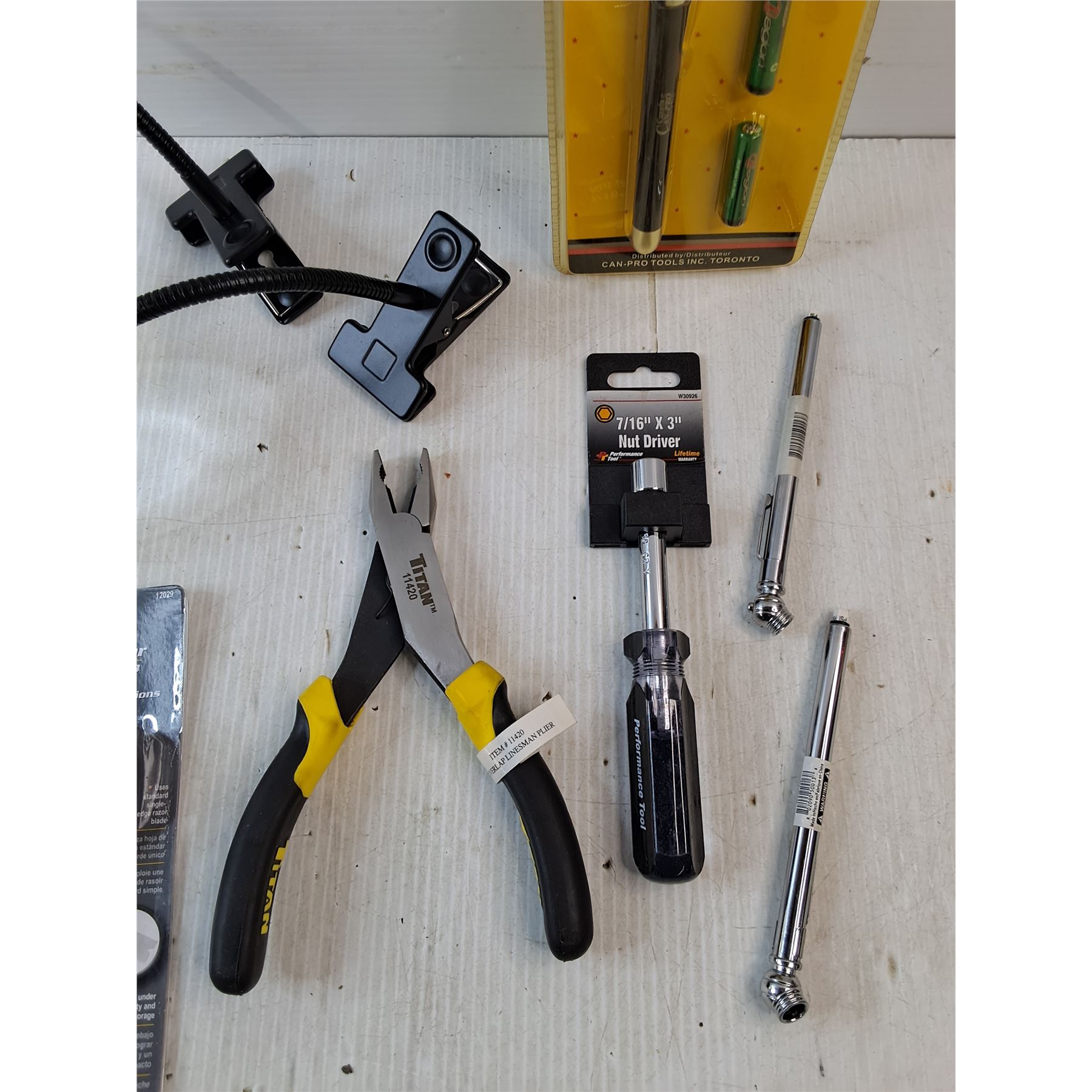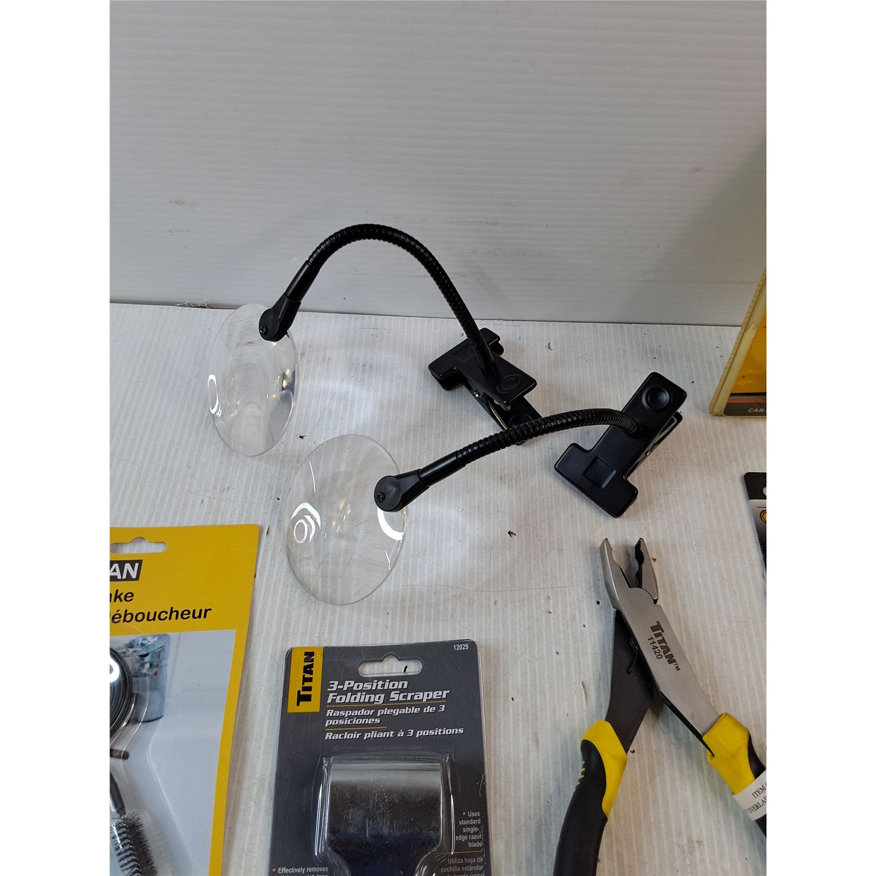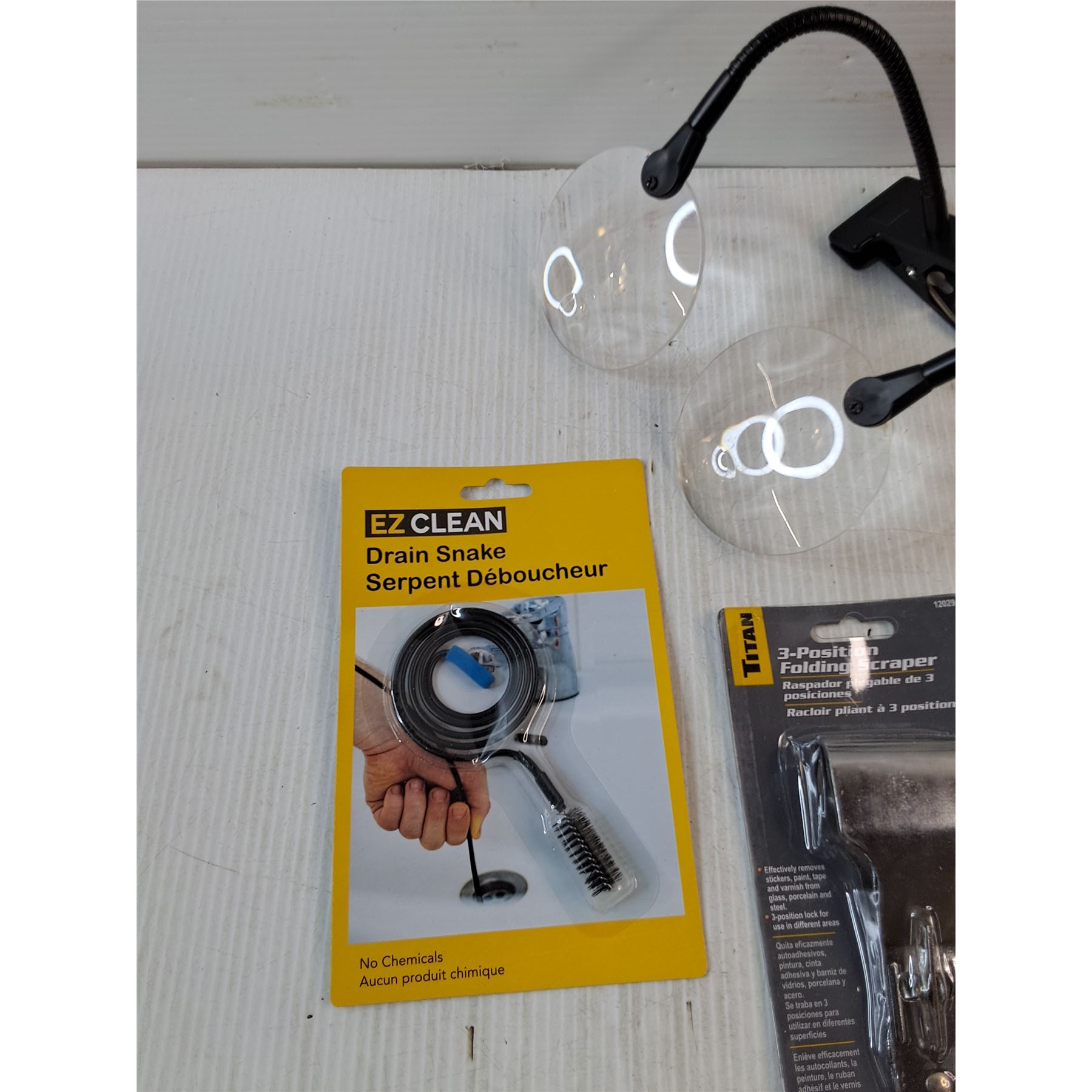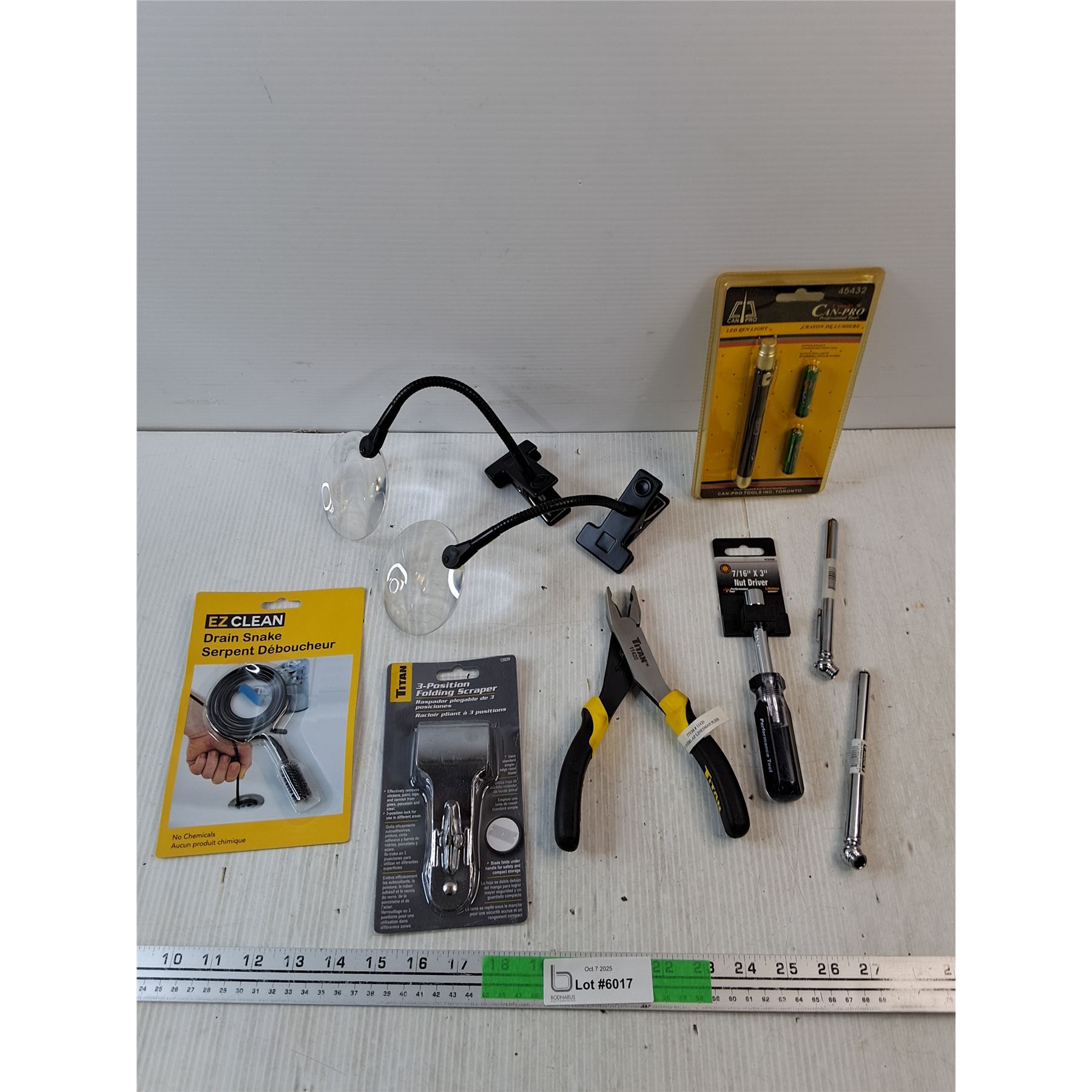Clip On Magnifying Glass, Drain Snake, Titan Pliers, Nut Driver, Tire Pressure Gauge, Misc