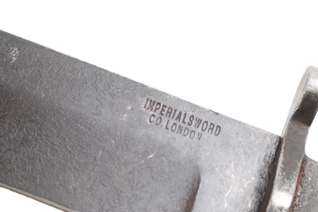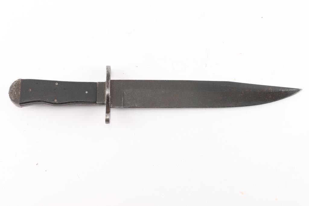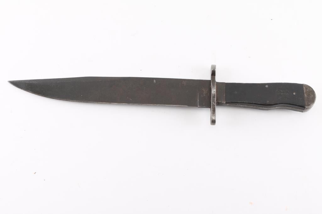 Mid to late 19th century clip point Bowie knife, marked Imperial Sword Co., London (no England). Iron mounted w/ dark hardwood scales, possibly rosewood. Approx. 9-7/8" blade and 15" overall. Uncleaned with full dimensional blade showing no sharpening or alteration. Dark "as found" uncleaned "out of the attic" condition.