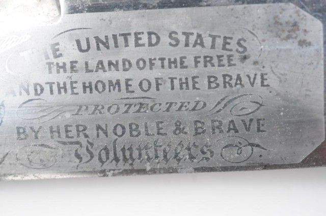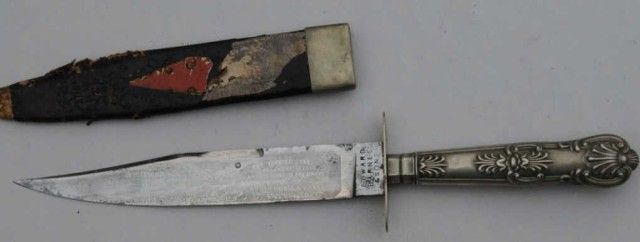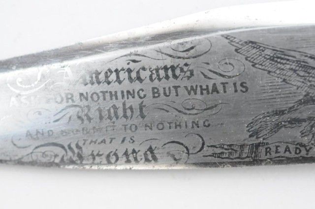 Clip point Bowie knife with cutlery handle and original scabbard marked “Edward Barnes & Sons”; fancy etched blade “Americans Ask For Nothing But What Is Right and Submit to Nothing That is Wrong” with American Eagleholding Banner that reads “Ready to Defend” and “The United States, The Land of Free and The Home of the Brave and Protected by Her Noble and Brave Volunteers”. The blade shows most of the original polish with slight aging and minor erosion just starting; the blade is crisp and unsharpened; the grip is oxidized slightly. From an old collection in Auburn, CA in the heart of the Gold Country. Est.: $1,250-$2,500.