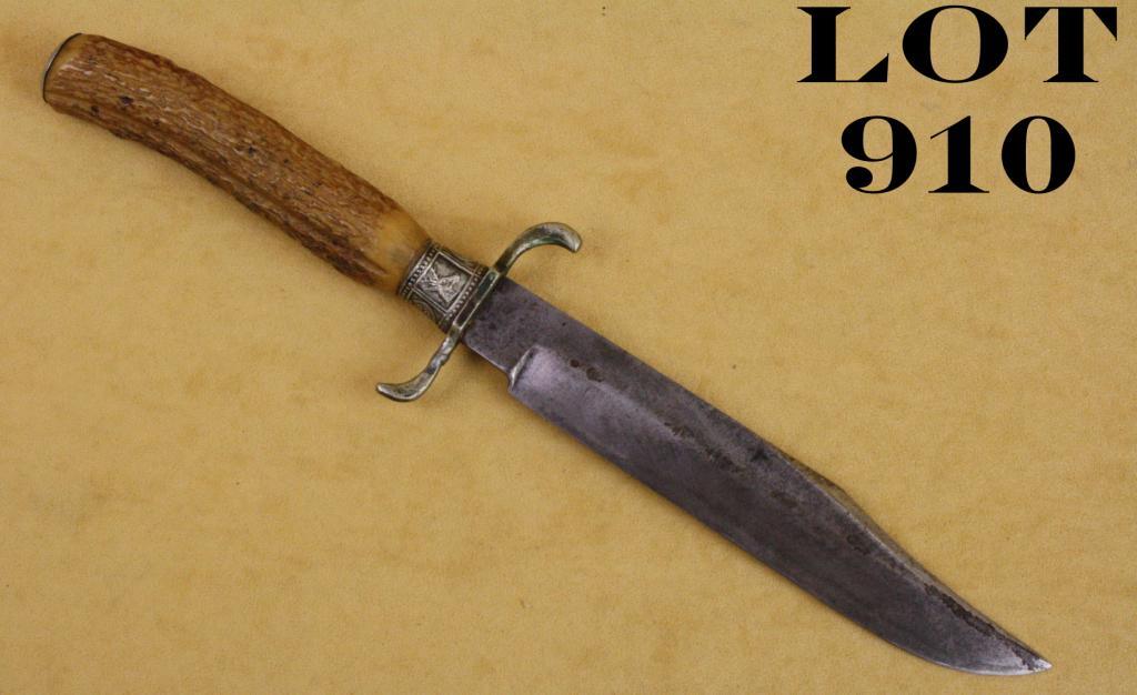 Clip point belt-size knife with round stag handle approx. 12-1/2” overall with an approx. 7” blade marked “OVB; Our Very Best” on the left flat and “Hibbard, Spencer, Bartlett & Co., England” on the left hilt;some wear to the blade with evidence of an old sharpening and cleaning but overall good appearance; nice stag grip with simple disc pommel and “S” shaped cross guard and designed metal piece surrounding the hiltportion of the grip; blade is slightly loose in the grip. Est.: $150-$300.