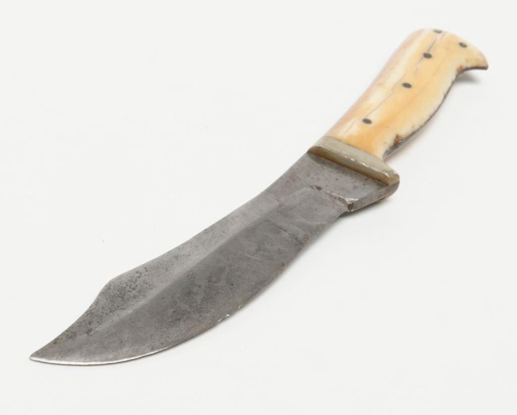 Clip point curved blade knife, approx. 9” overall with a 5-1/4” blade marked “C.M. King” at ricasso with 5 pin marine ivory scales, simple German silver bolster in overall good condition with blade showing a grey patina, minor pitting,marking is light, some scratching; grip scales with age cracks and a loss on the lower right rear scale; accompanied by a brown leather sheath in overall good condition with some scuffing and two of three copper snaps remaining along with leather belt loop. Est.: $1,500-$3,000.