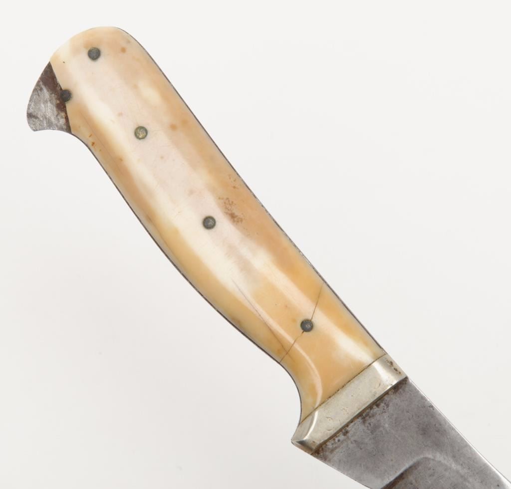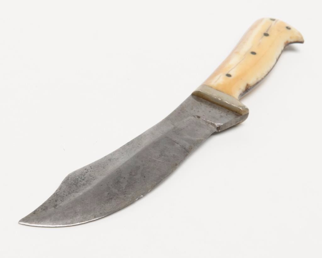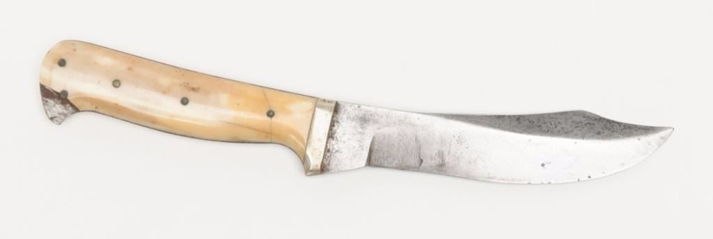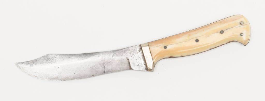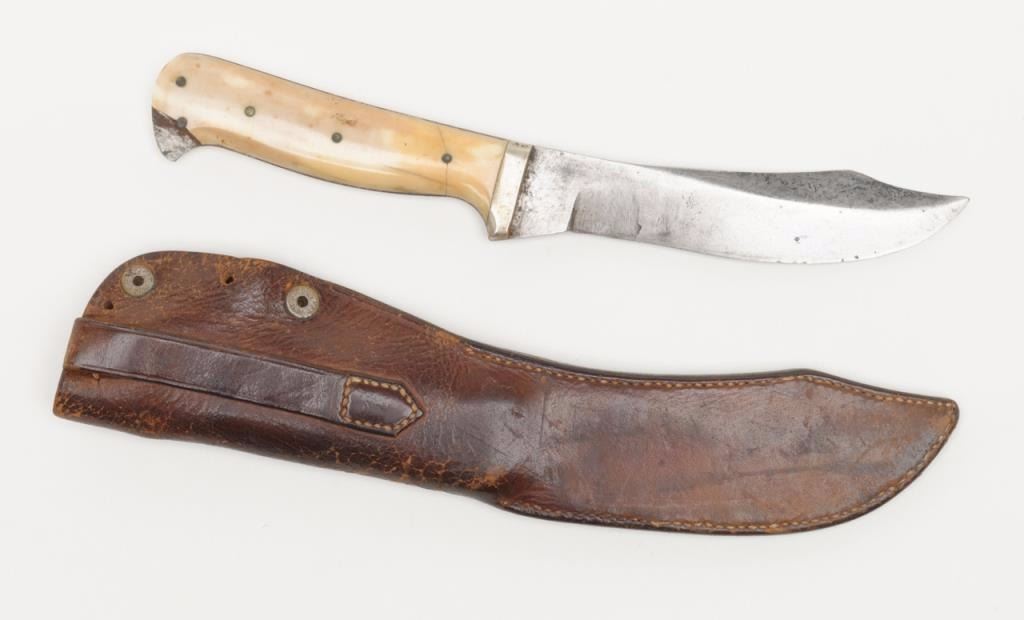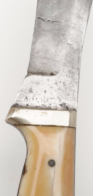 with a 5.25” blade marked “C.M. King” at ricasso with 5-pin marine ivory scales; simple German silver bolster in overall good condition with blade showing a grey patina, minor pitting; marking is faint; some scratching. The grip scales show a beautiful toning and age cracks with a small loss on the lower right rear scale. Accompanied by a brown leather sheath in overall good condition displaying some scuffing and two of three copper snaps remaining along with leather belt loop. Est.: $500-1000