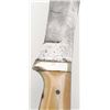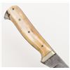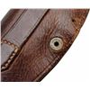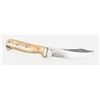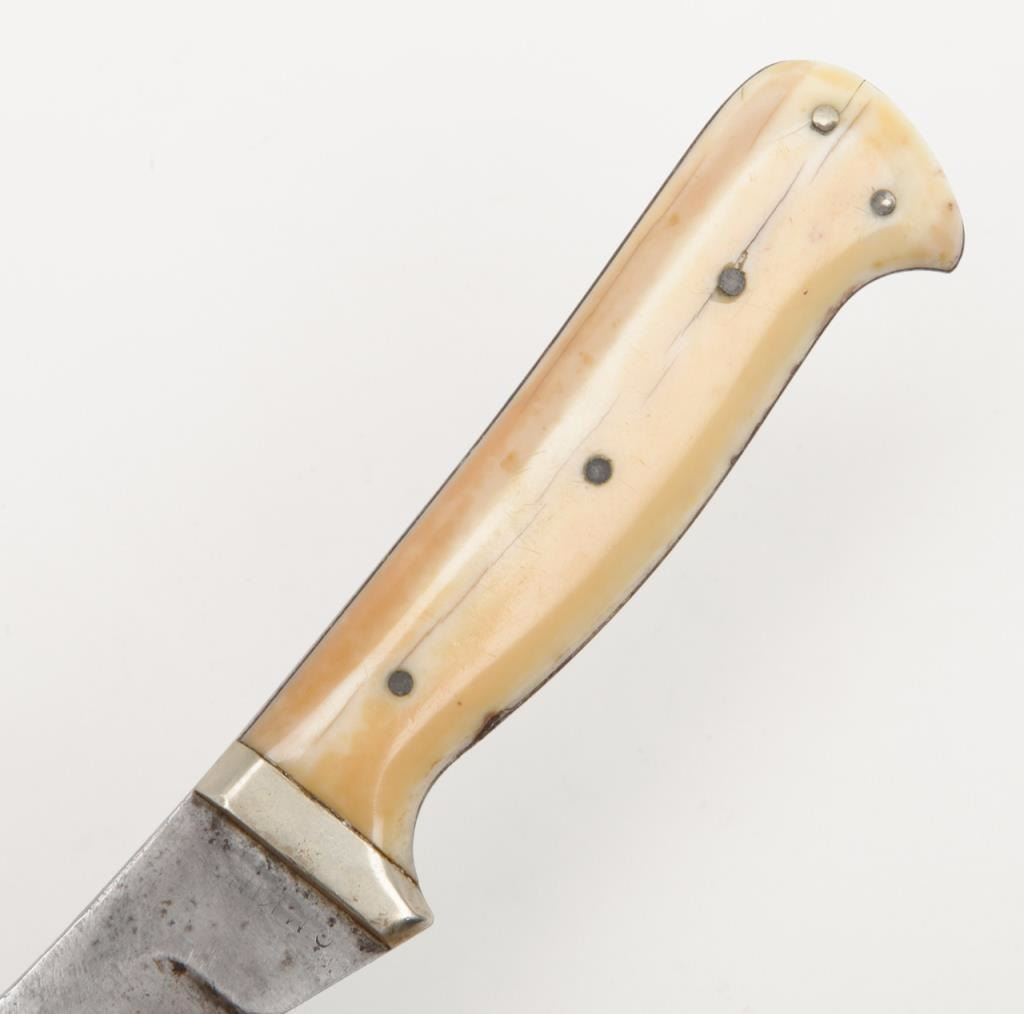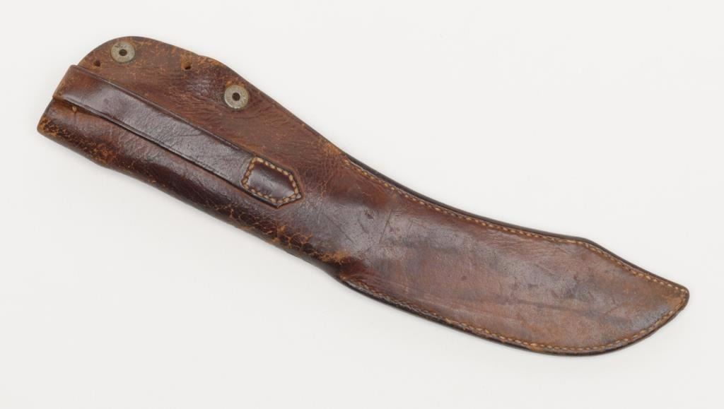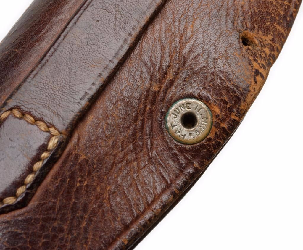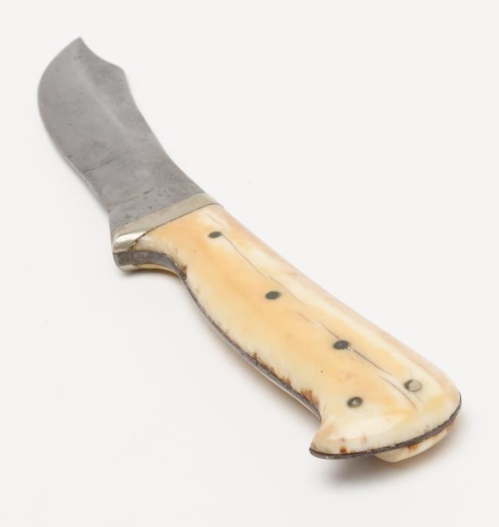 with a 5.25” blade marked “C.M. King” at ricasso with 5-pin marine ivory scales; simple German silver bolster in overall good condition with blade showing a grey patina, minor pitting; marking is faint; some scratching. The grip scales show a beautiful toning and age cracks with a small loss on the lower right rear scale. Accompanied by a brown leather sheath in overall good condition displaying some scuffing and two of three copper snaps remaining along with leather belt loop. Est.: $500-1000